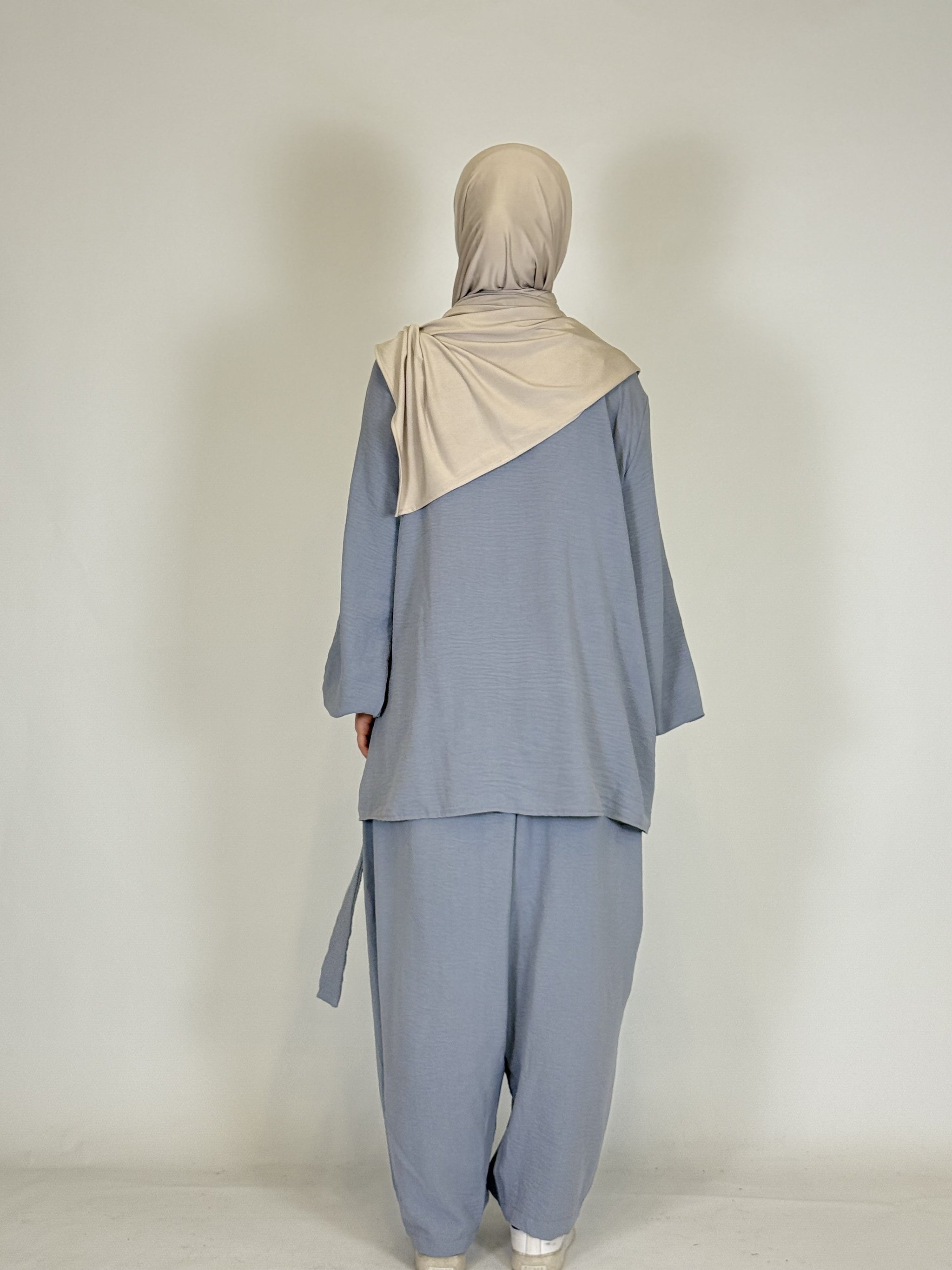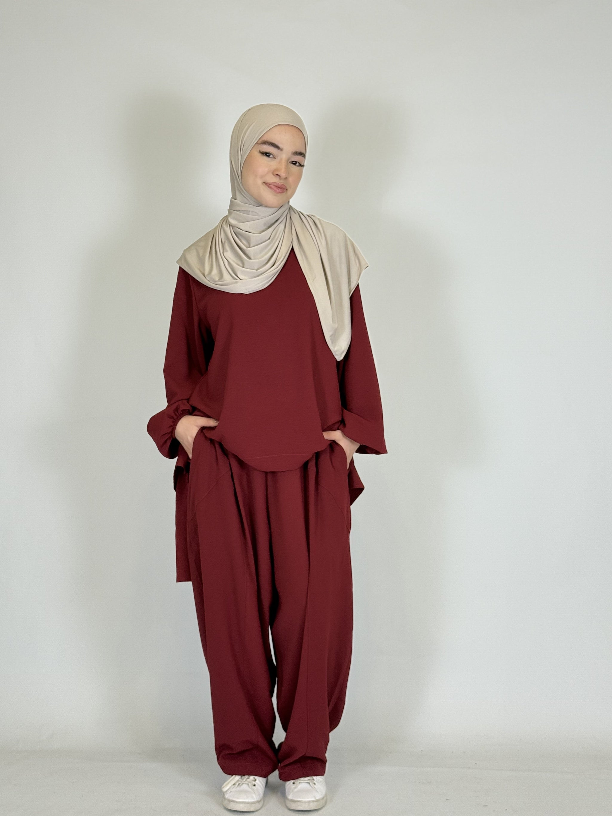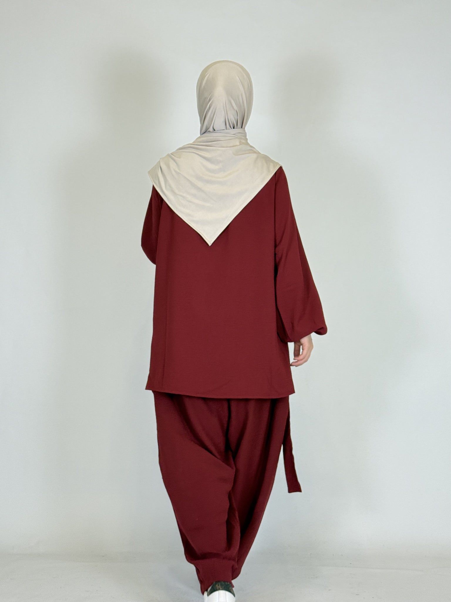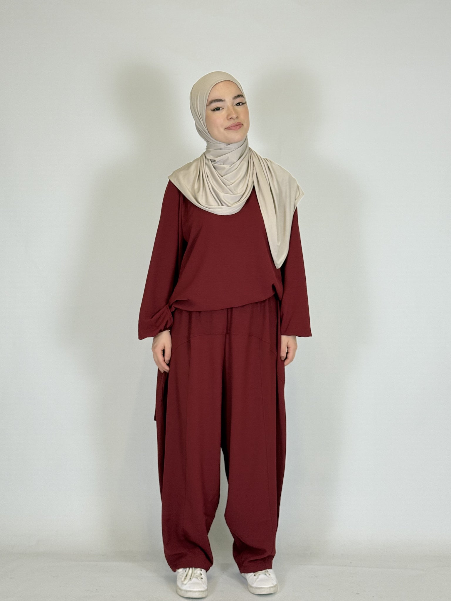 Unser eleganter Zweiteiler besteht aus einem weit geschnittenen Şalvar – einem Hosenrock mit praktischen Seitentaschen – sowie einem passenden langen Oberteil.