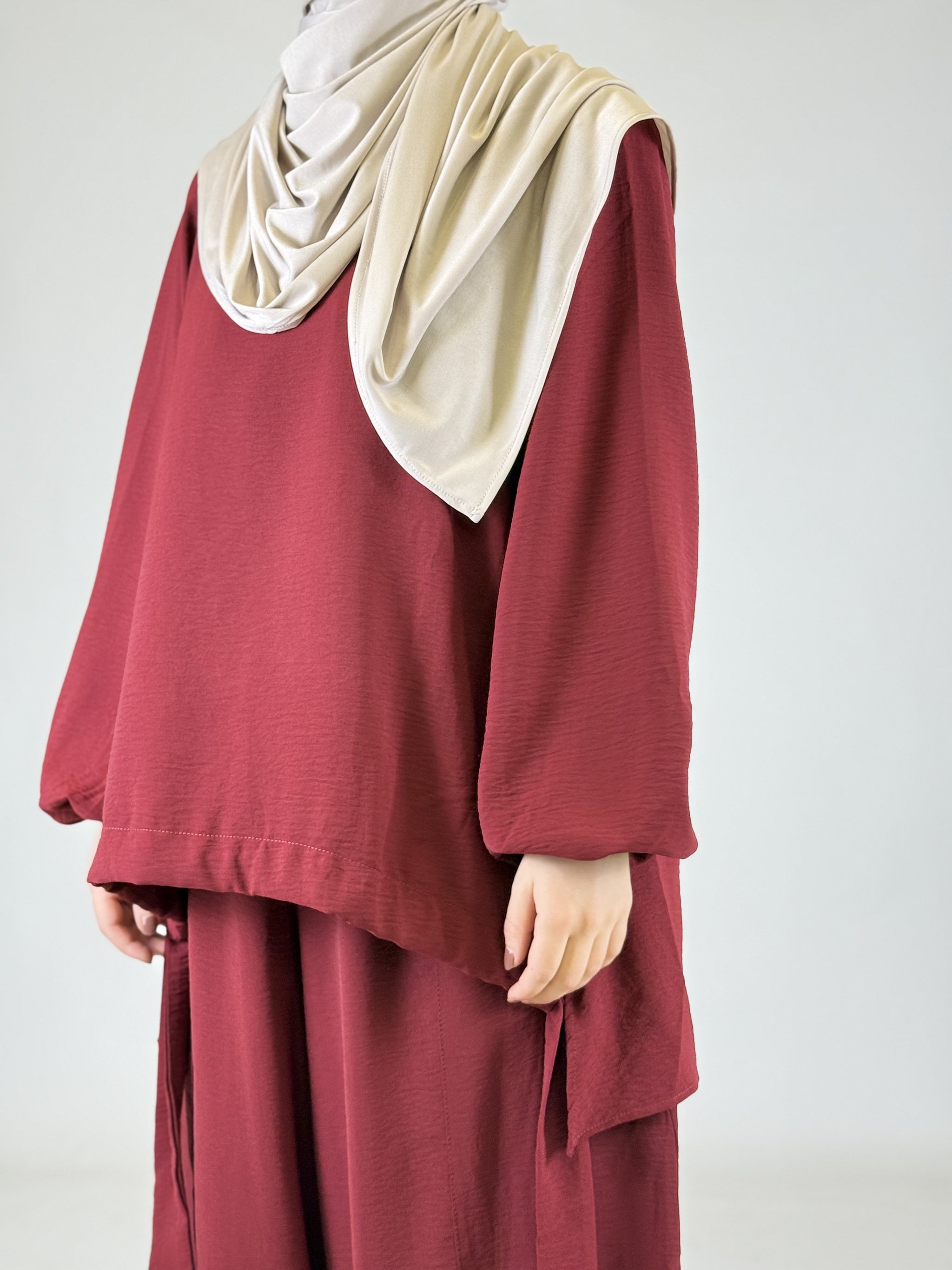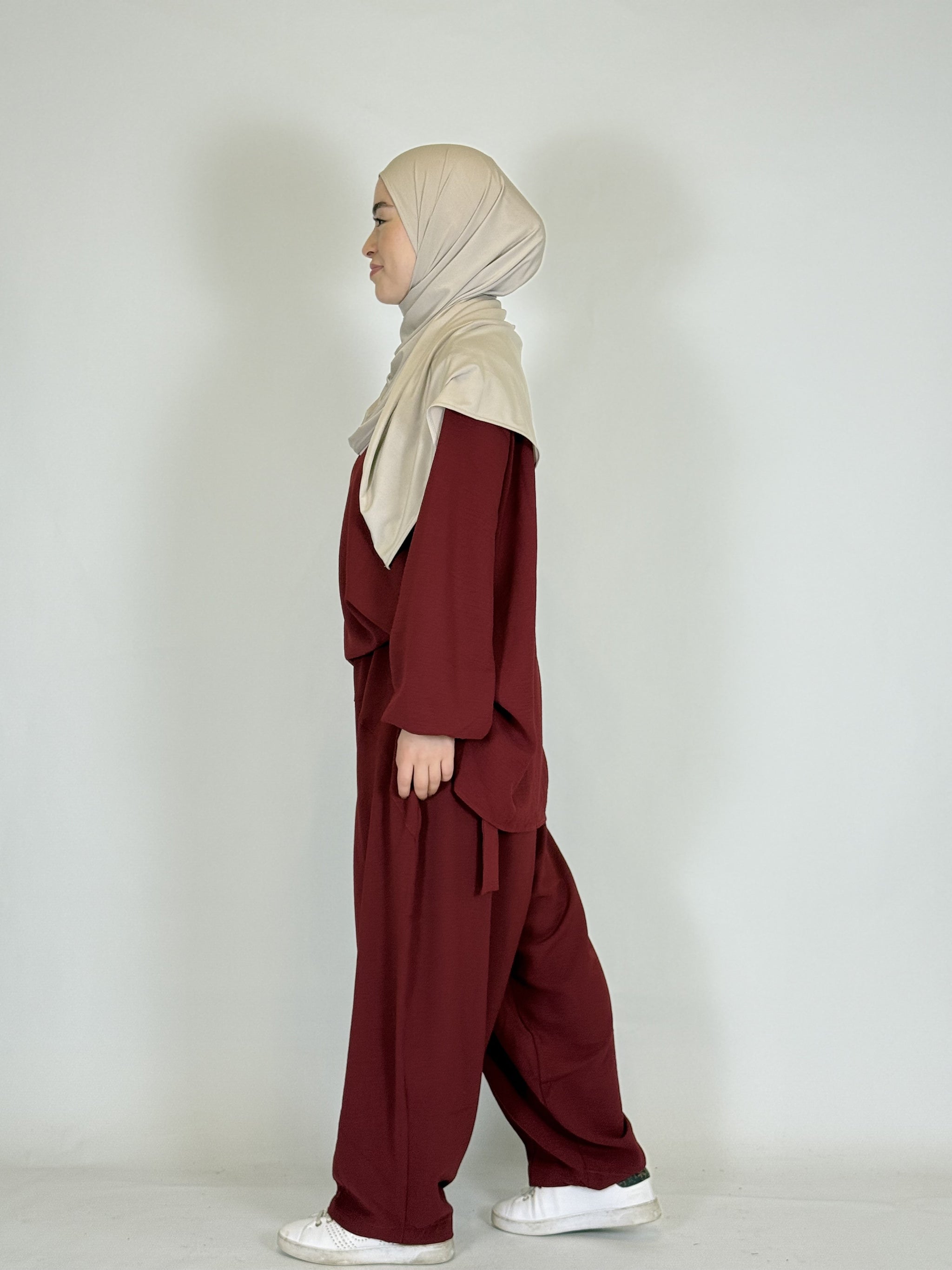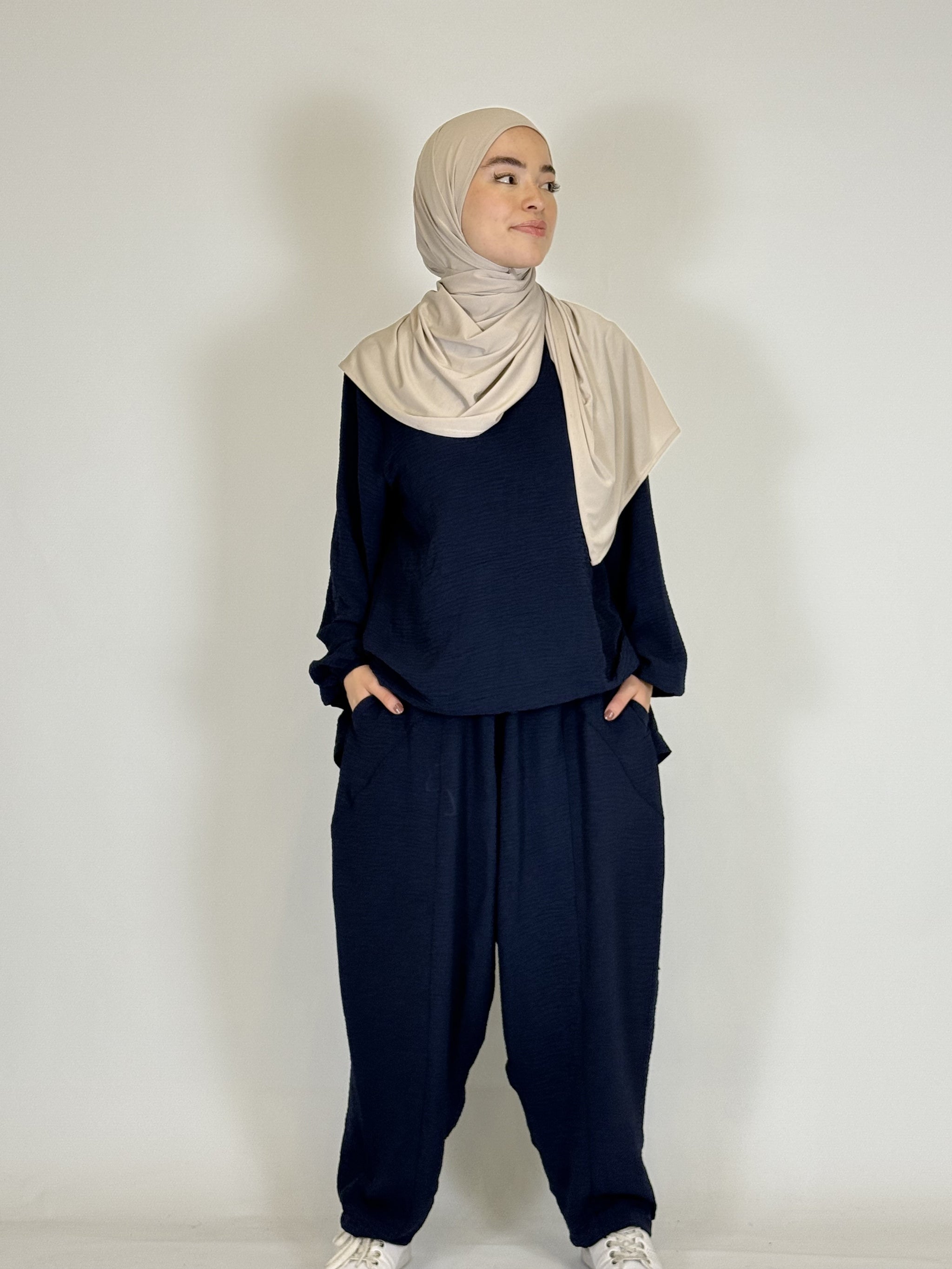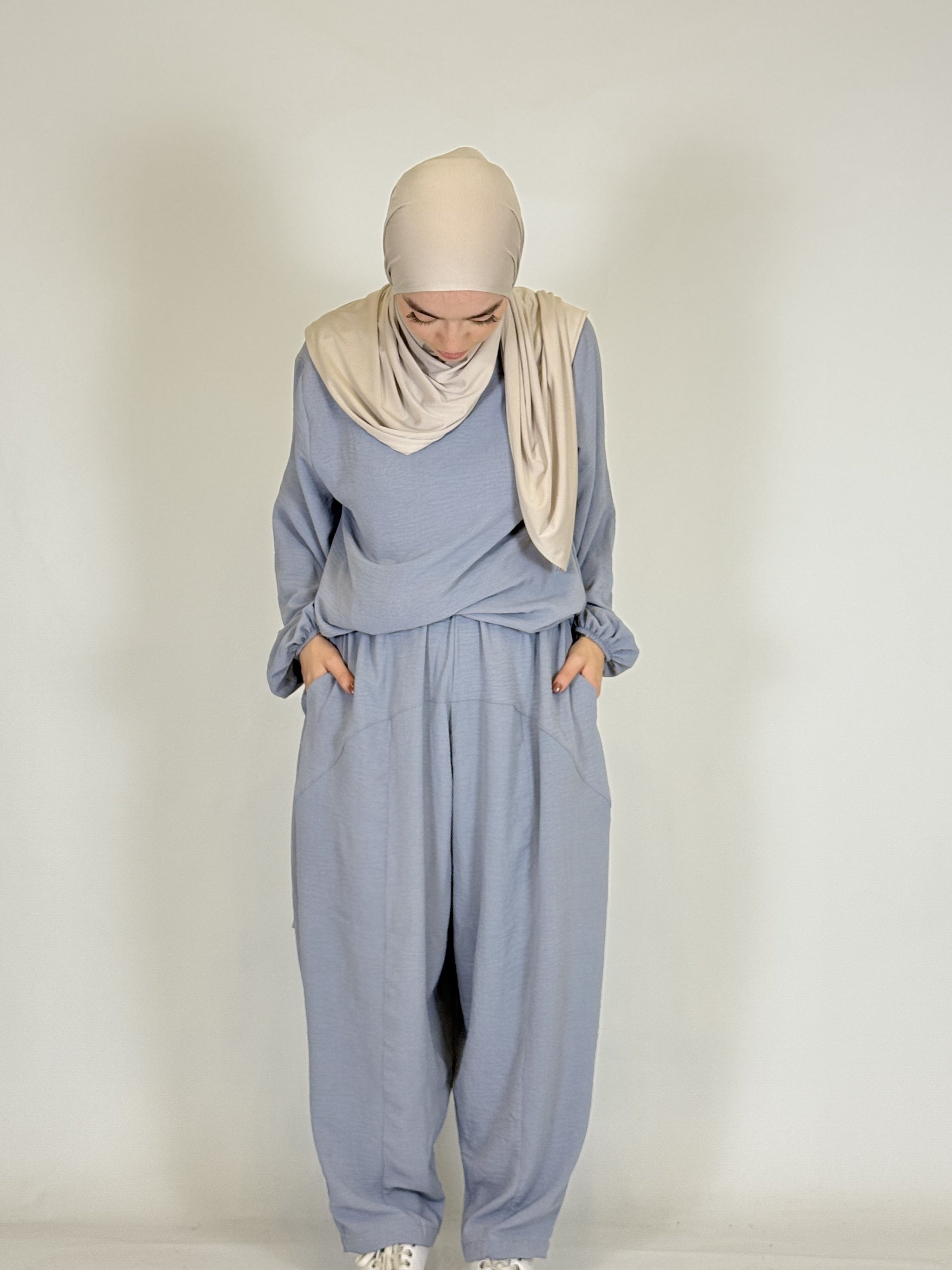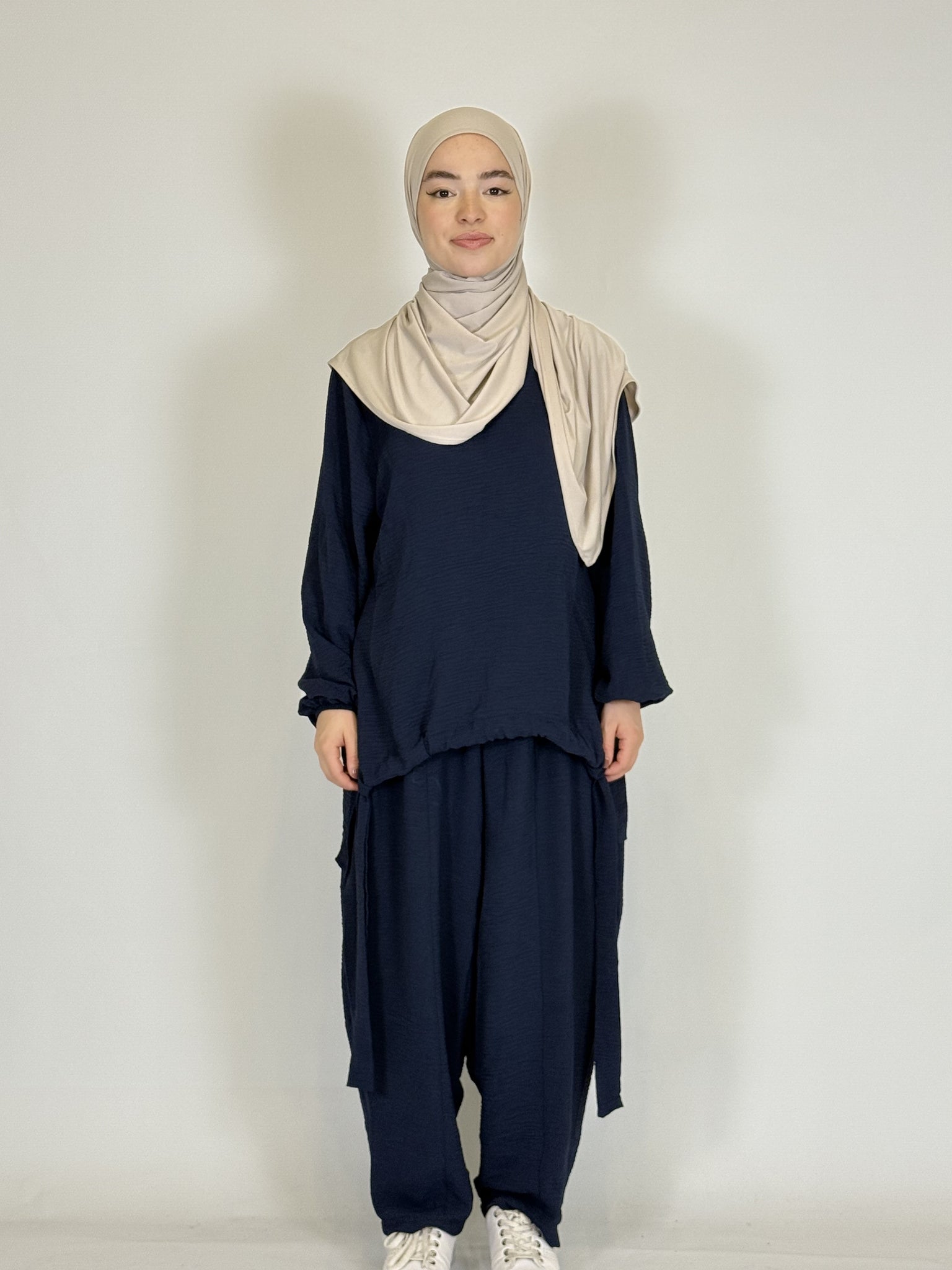 Unser eleganter Zweiteiler besteht aus einem weit geschnittenen Şalvar – einem Hosenrock mit praktischen Seitentaschen – sowie einem passenden langen Oberteil.