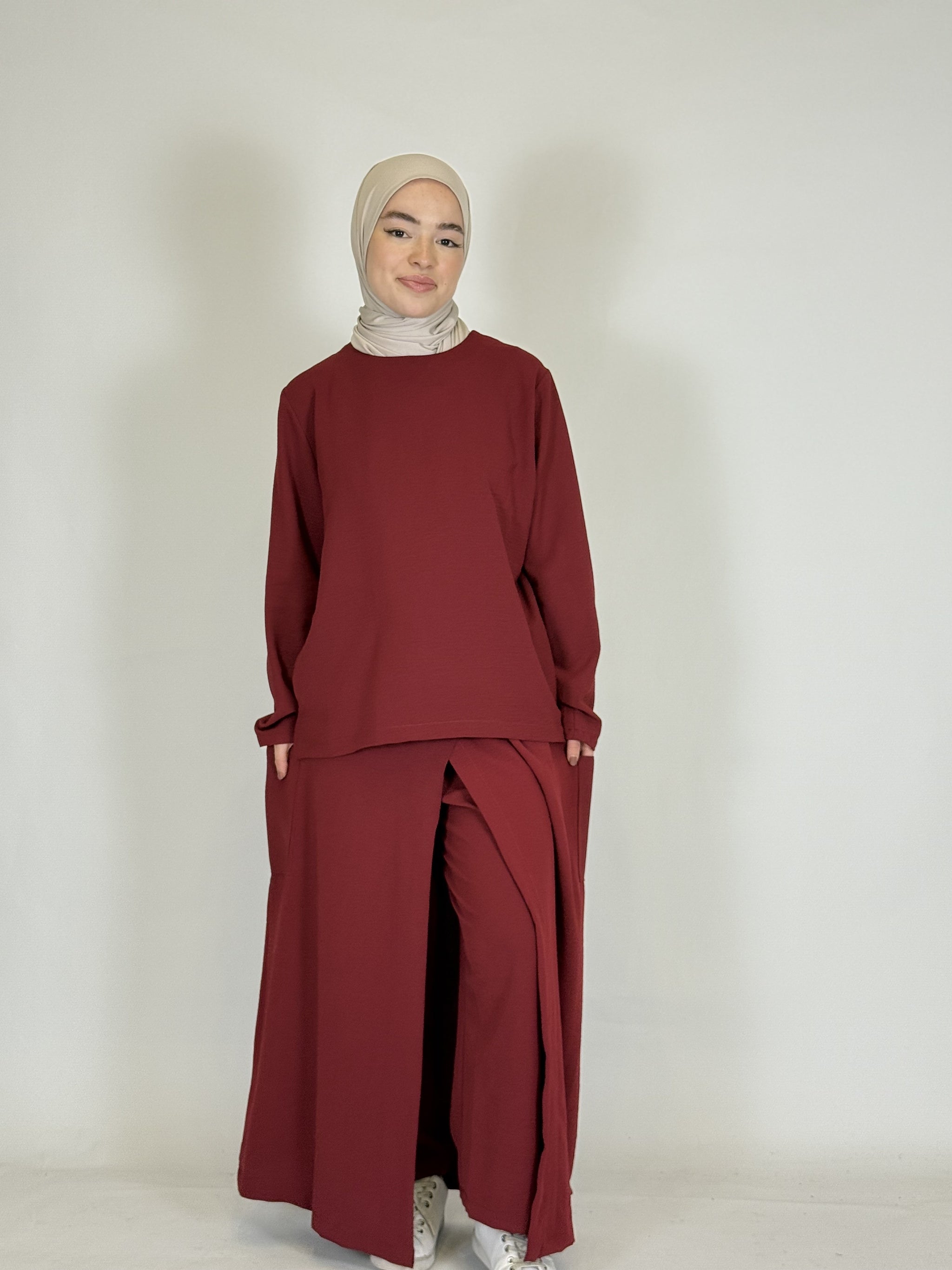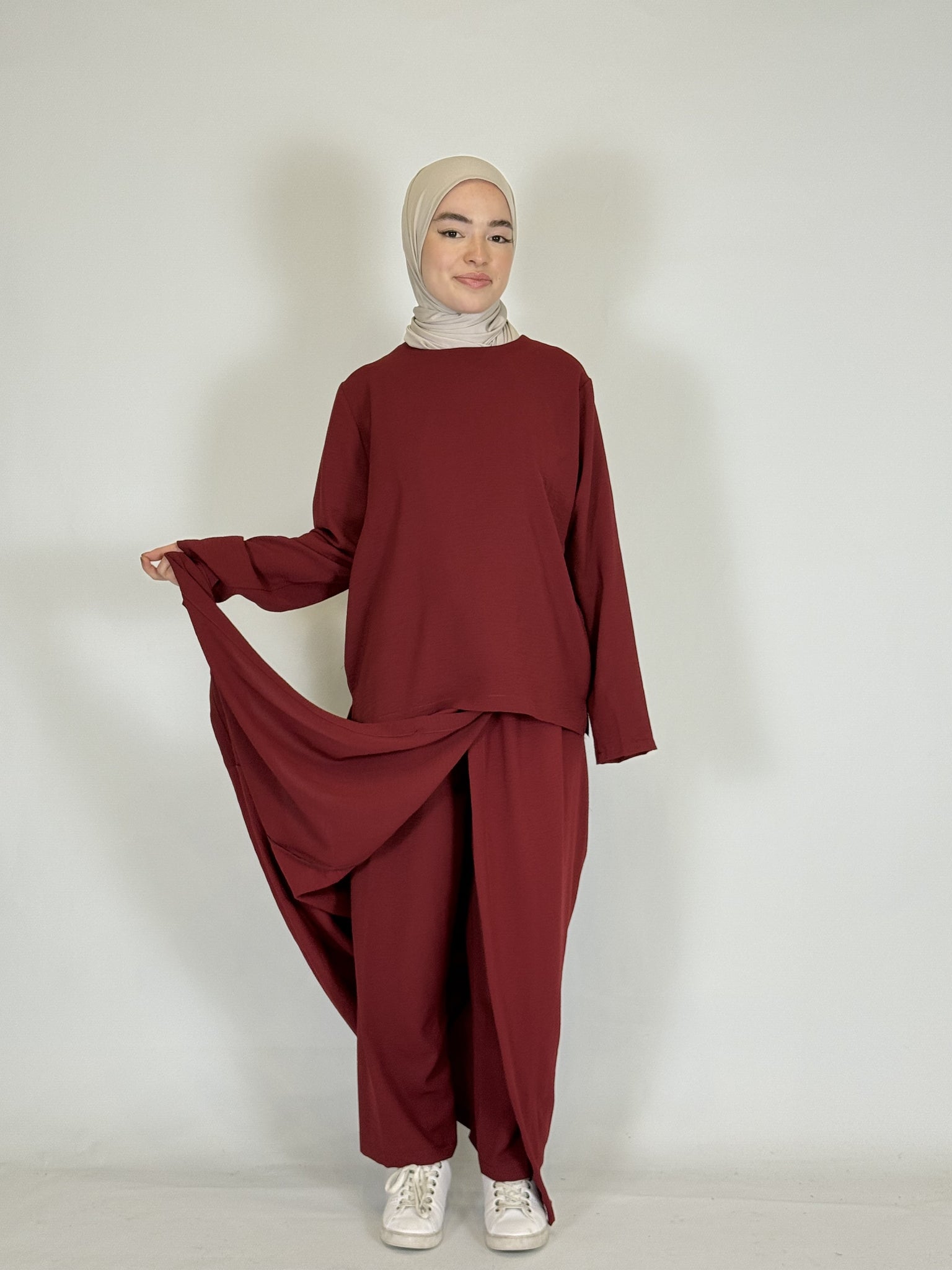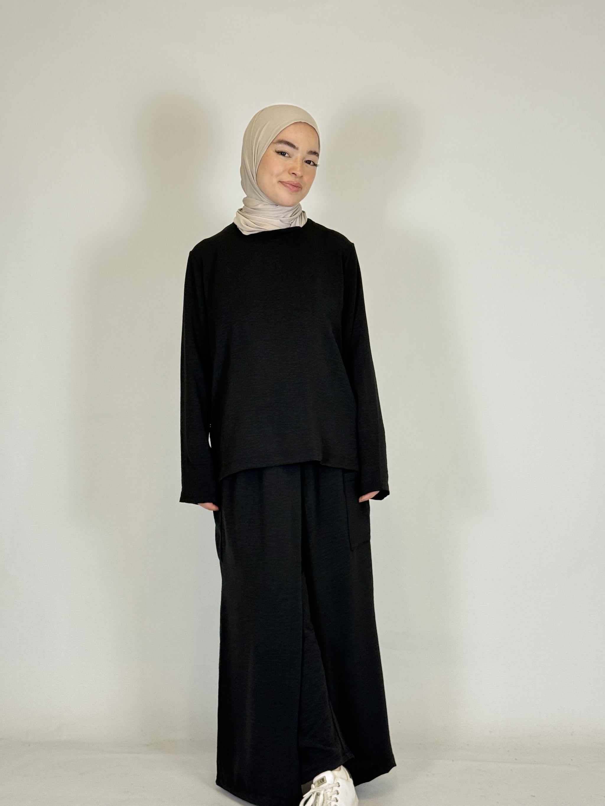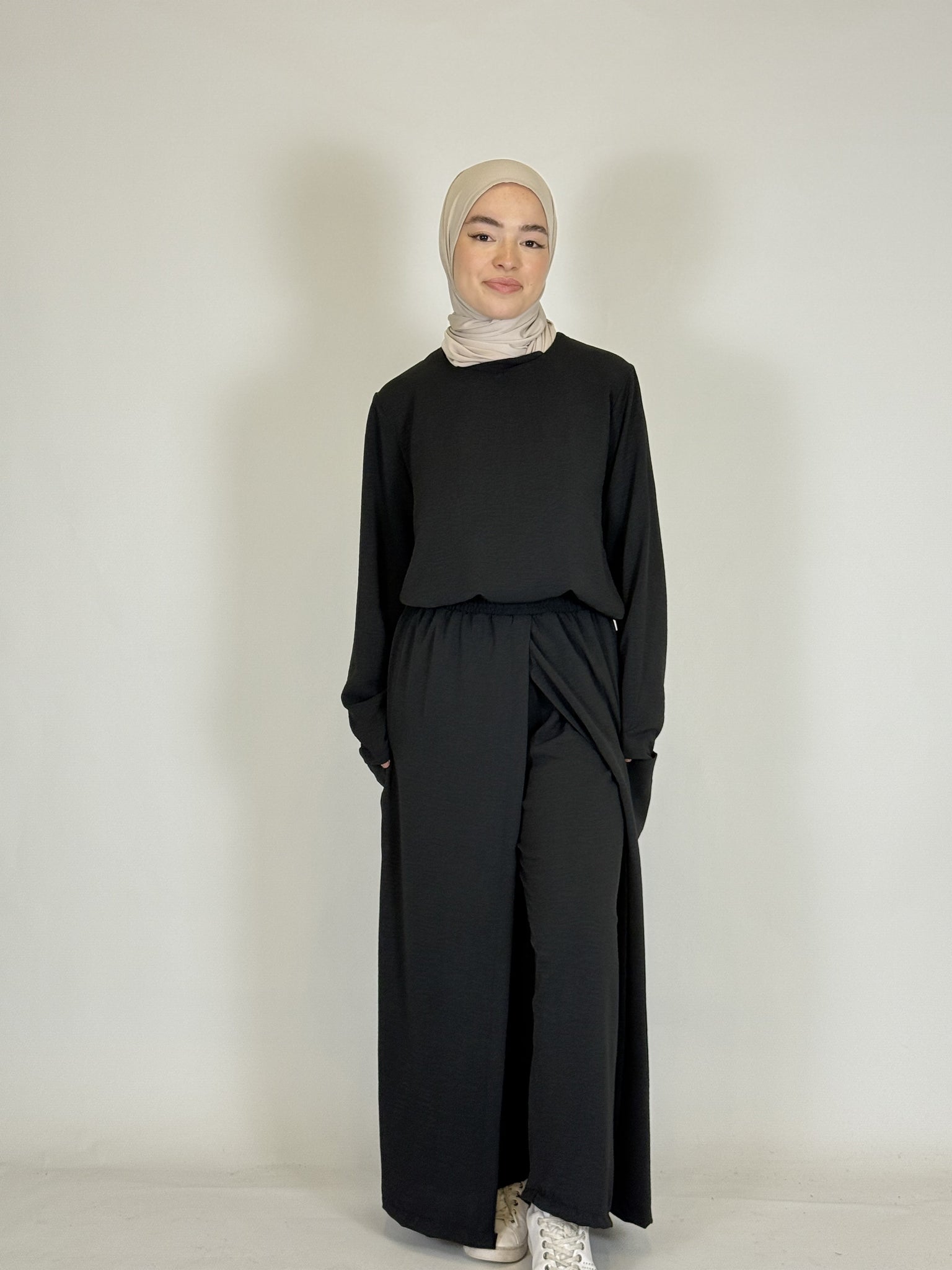 Das lange Oberteil rundet den modesten Look perfekt ab.