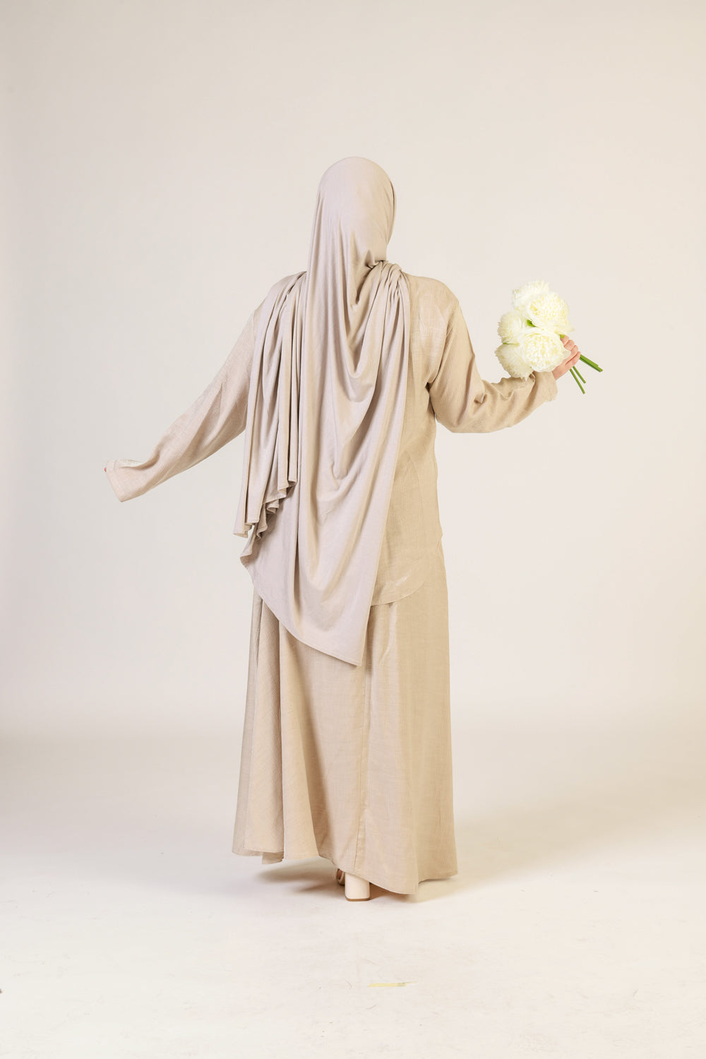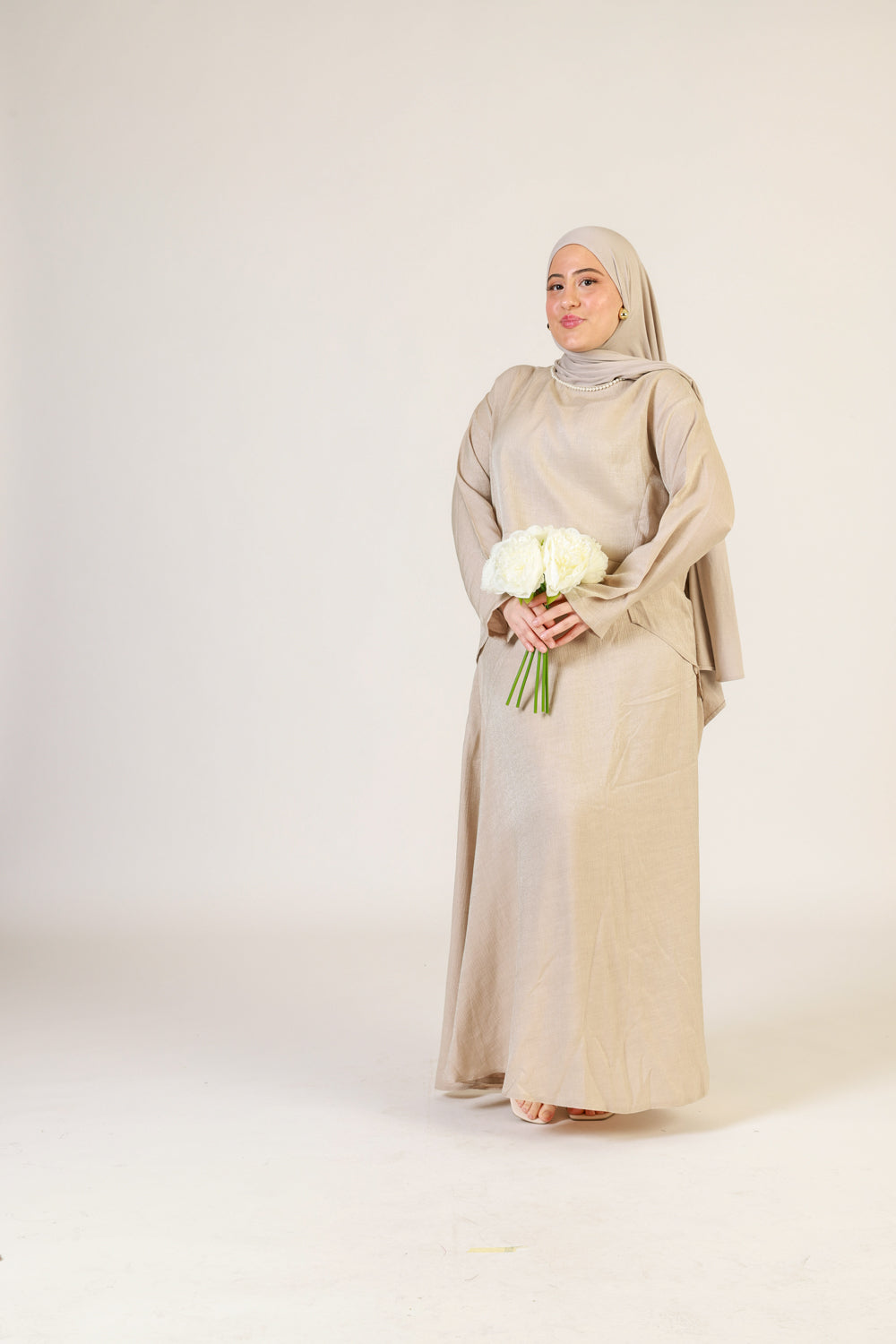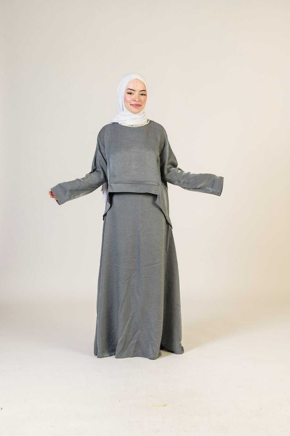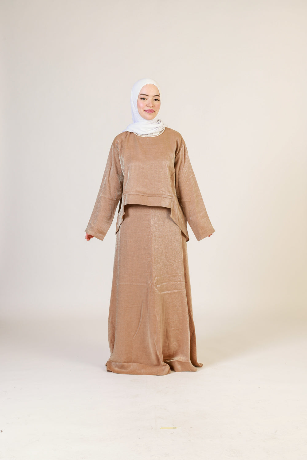 Dieser Zweiteiler ist perfekt für besondere Anlässe geeignet. Der obere Teil ist mit Perlen verziert. Der Stoff besteht aus Baumwolle und glitzert. Das Model ist 159 cm groß und trägt die kleinste Größe.