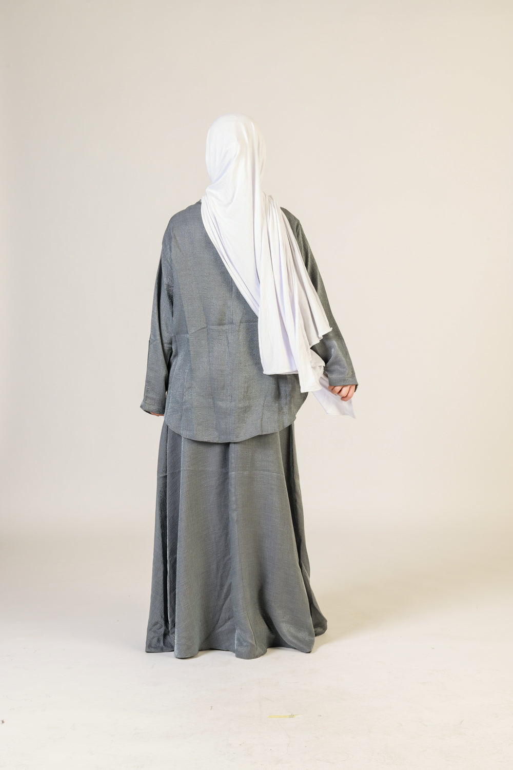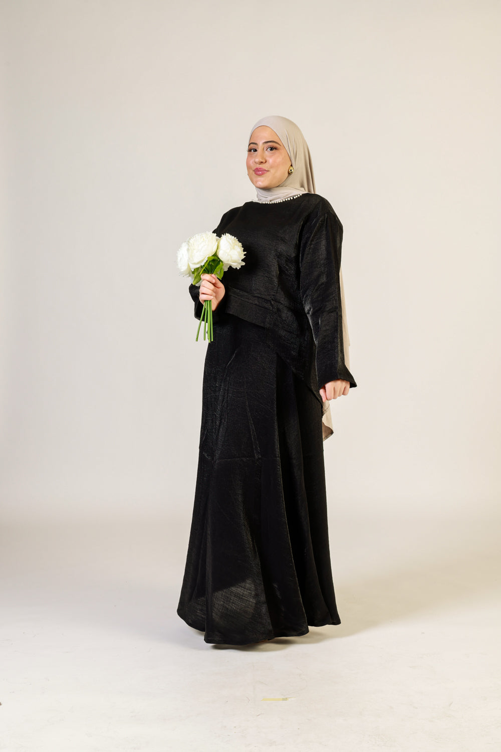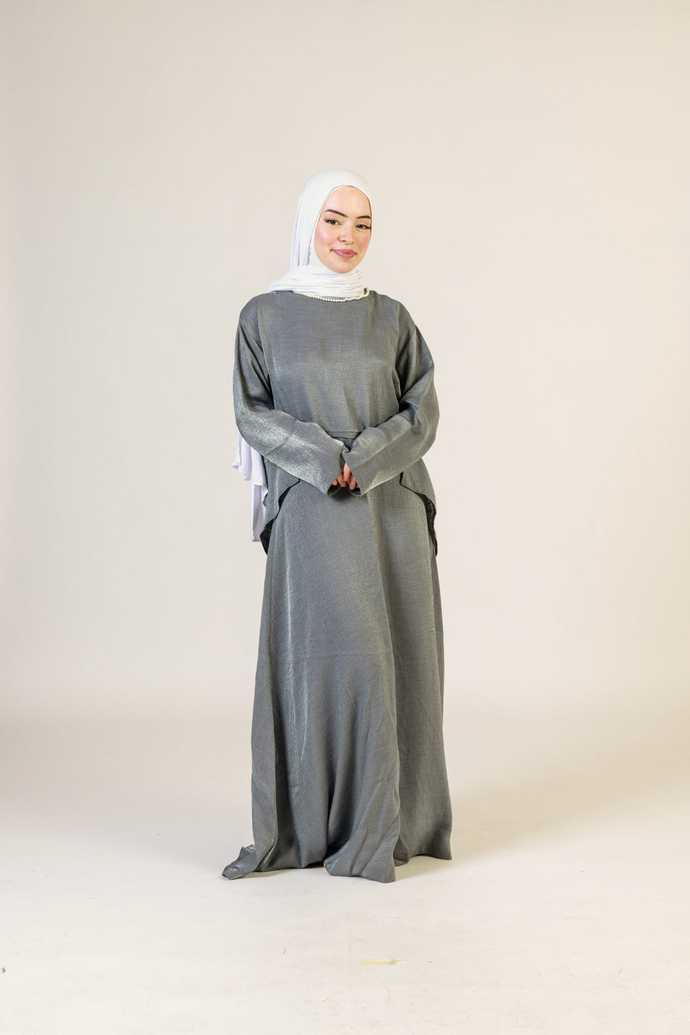 Dieser Zweiteiler ist perfekt für besondere Anlässe geeignet. Der obere Teil ist mit Perlen verziert. Der Stoff besteht aus Baumwolle und glitzert. Das Model ist 159 cm groß und trägt die kleinste Größe.