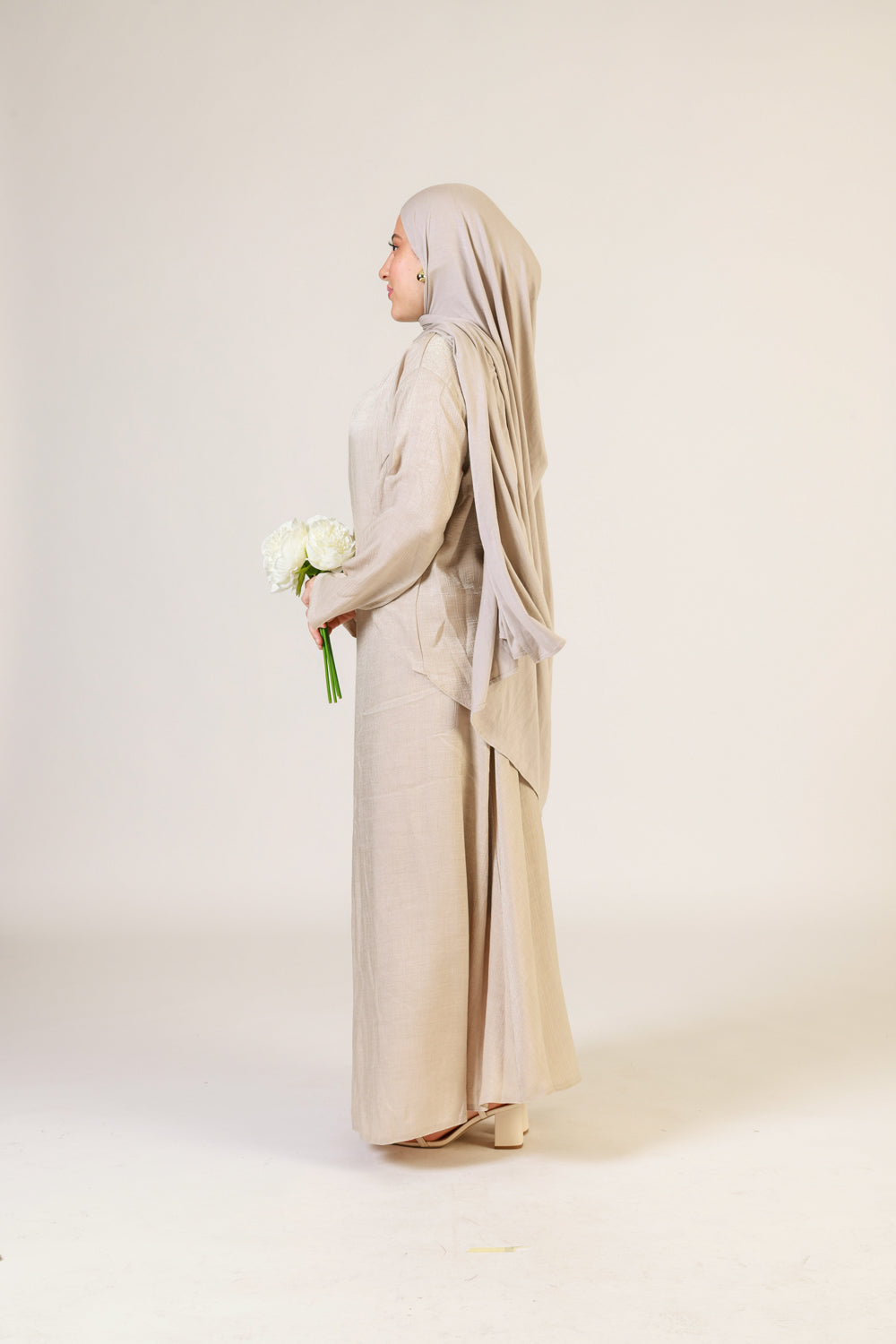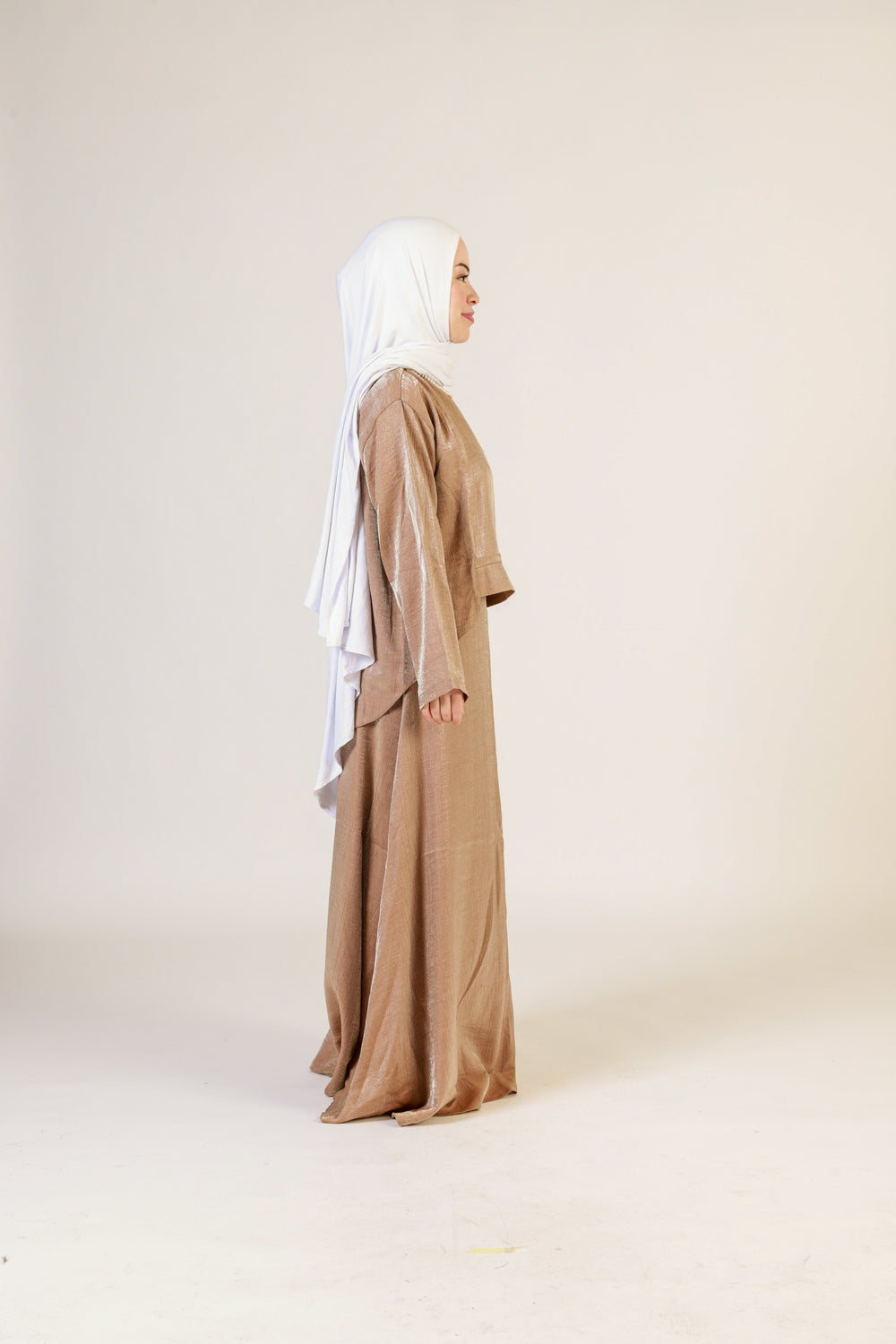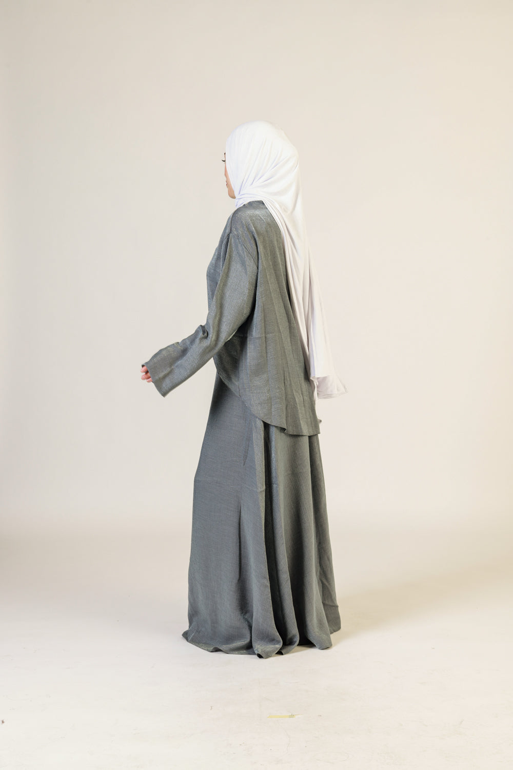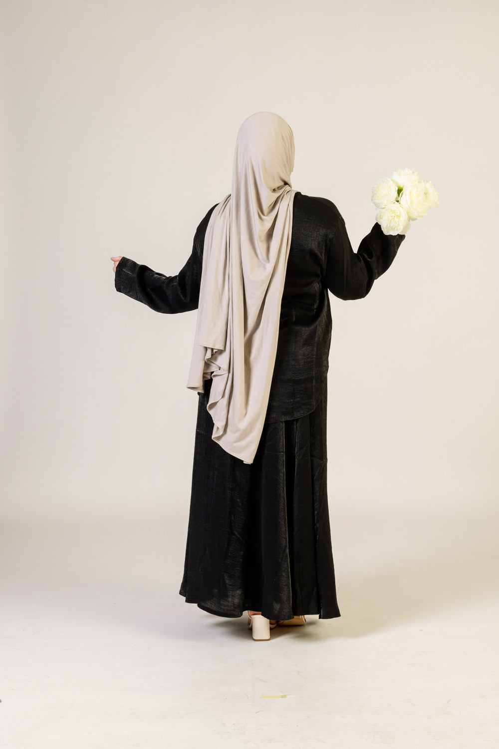 Dieser Zweiteiler ist perfekt für besondere Anlässe geeignet. Der obere Teil ist mit Perlen verziert. Der Stoff besteht aus Baumwolle und glitzert. Das Model ist 159 cm groß und trägt die kleinste Größe.