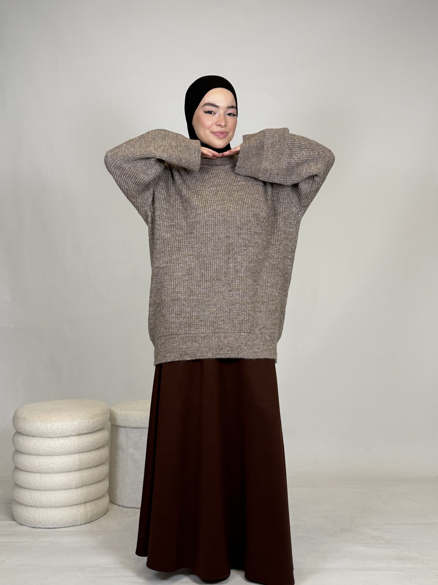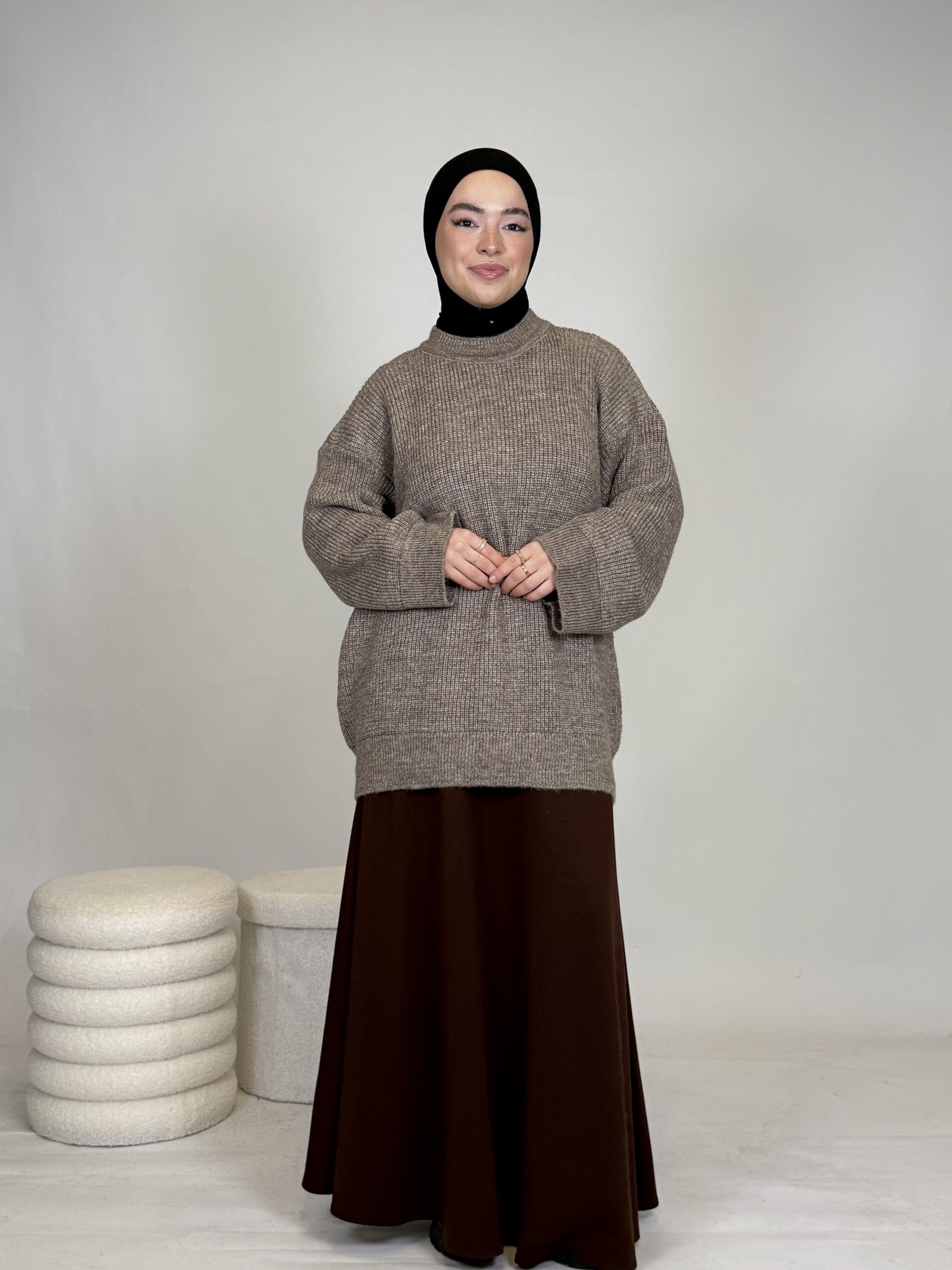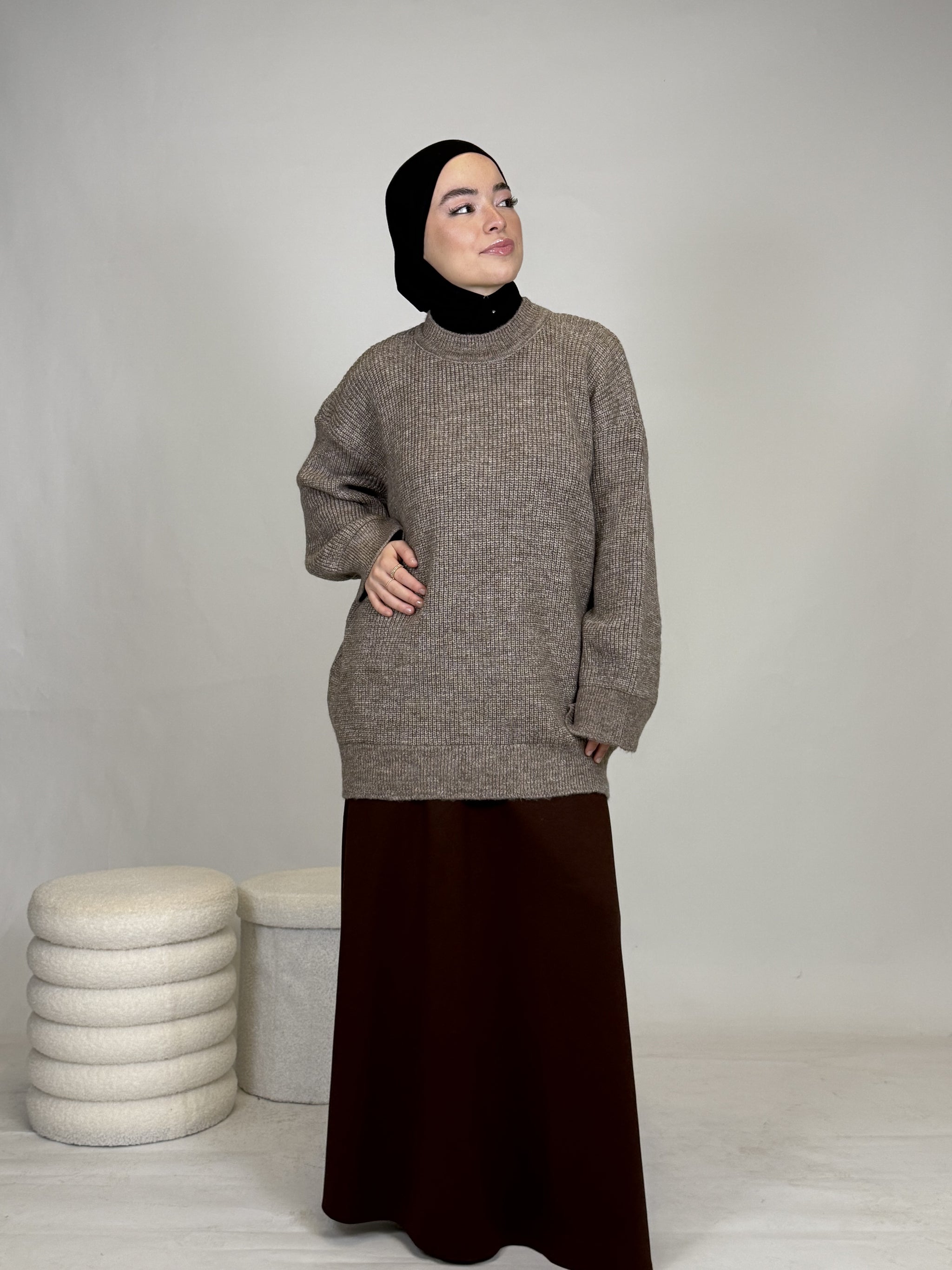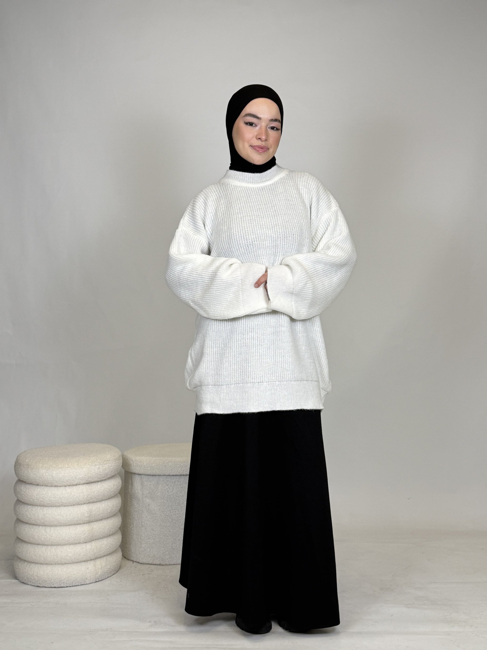 Dank seines vielseitigen Designs lässt sich das Oberteil mühelos kombinieren: lässig mit einer Hose oder elegant mit einem Rock, wie auf dem Bild. Ob casual, chic oder cozy, dieses Teil passt sich deinem Style an.