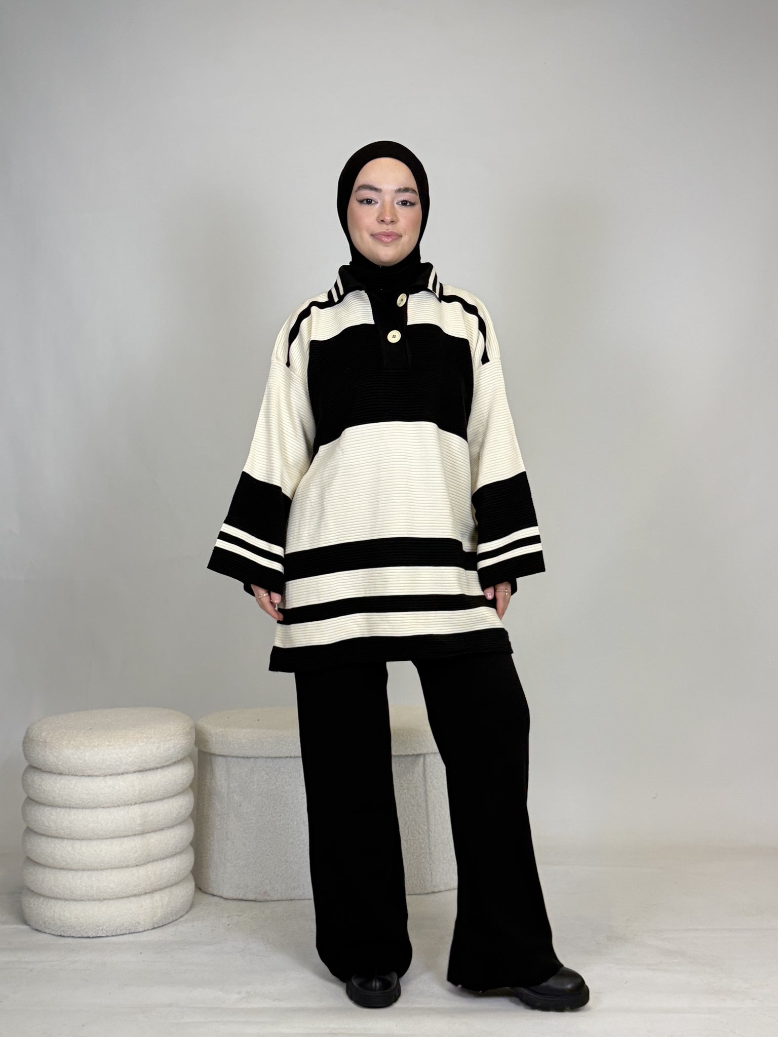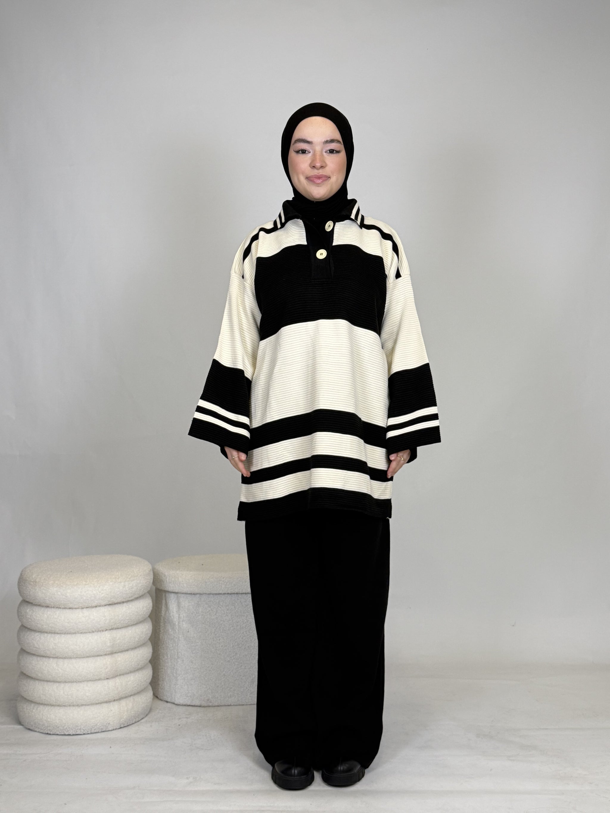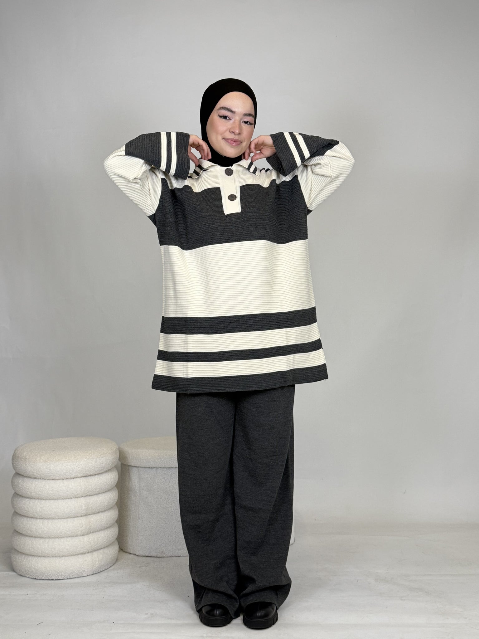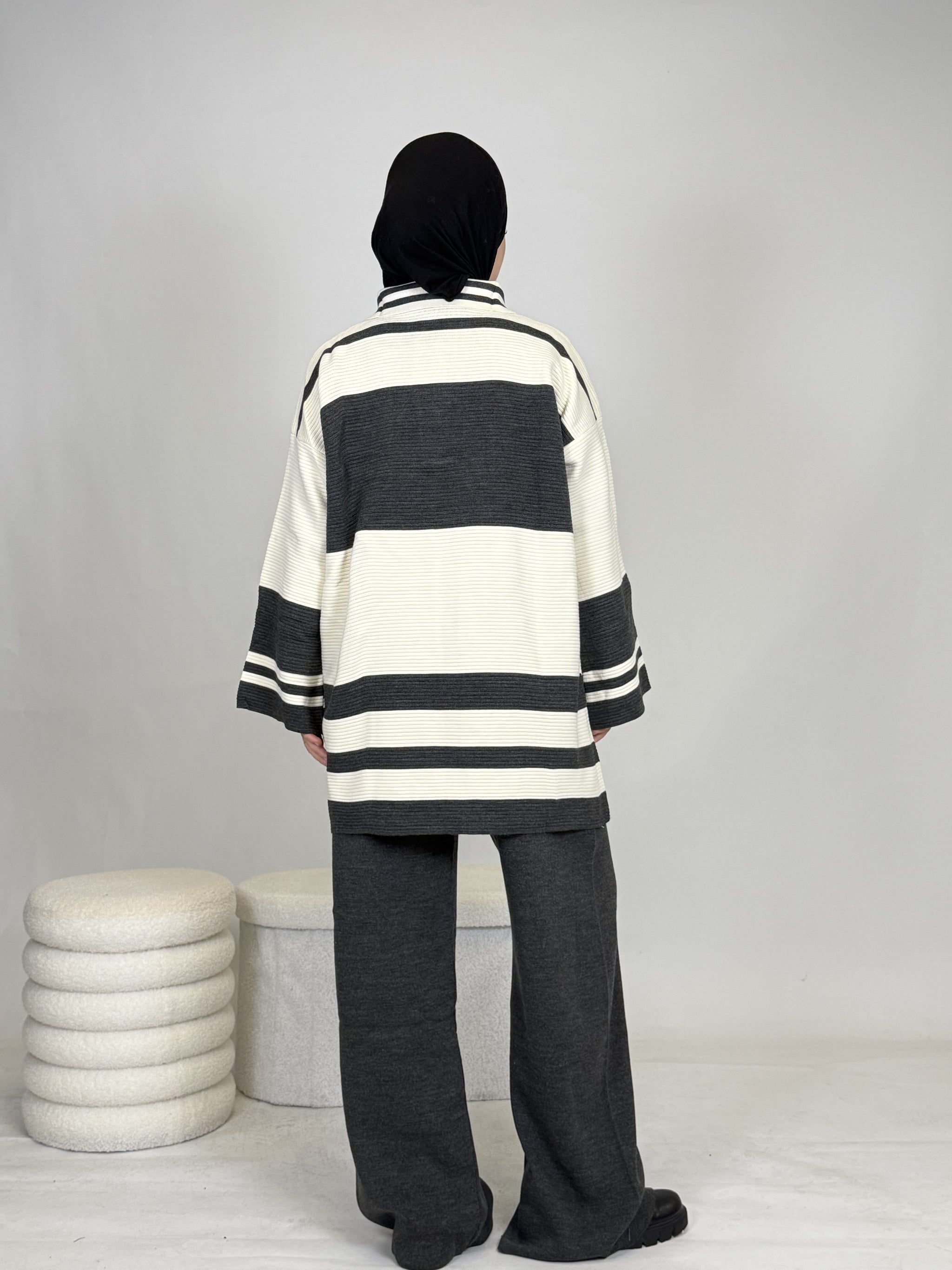 Das Set ist ideal, um sich stylisch und unkompliziert anzuziehen, hält dabei extrem warm und ist perfekt für Alltag oder besondere Anlässe. Das Oberteil ist breit geschnitten und bietet eine bequeme, moderne Passform.