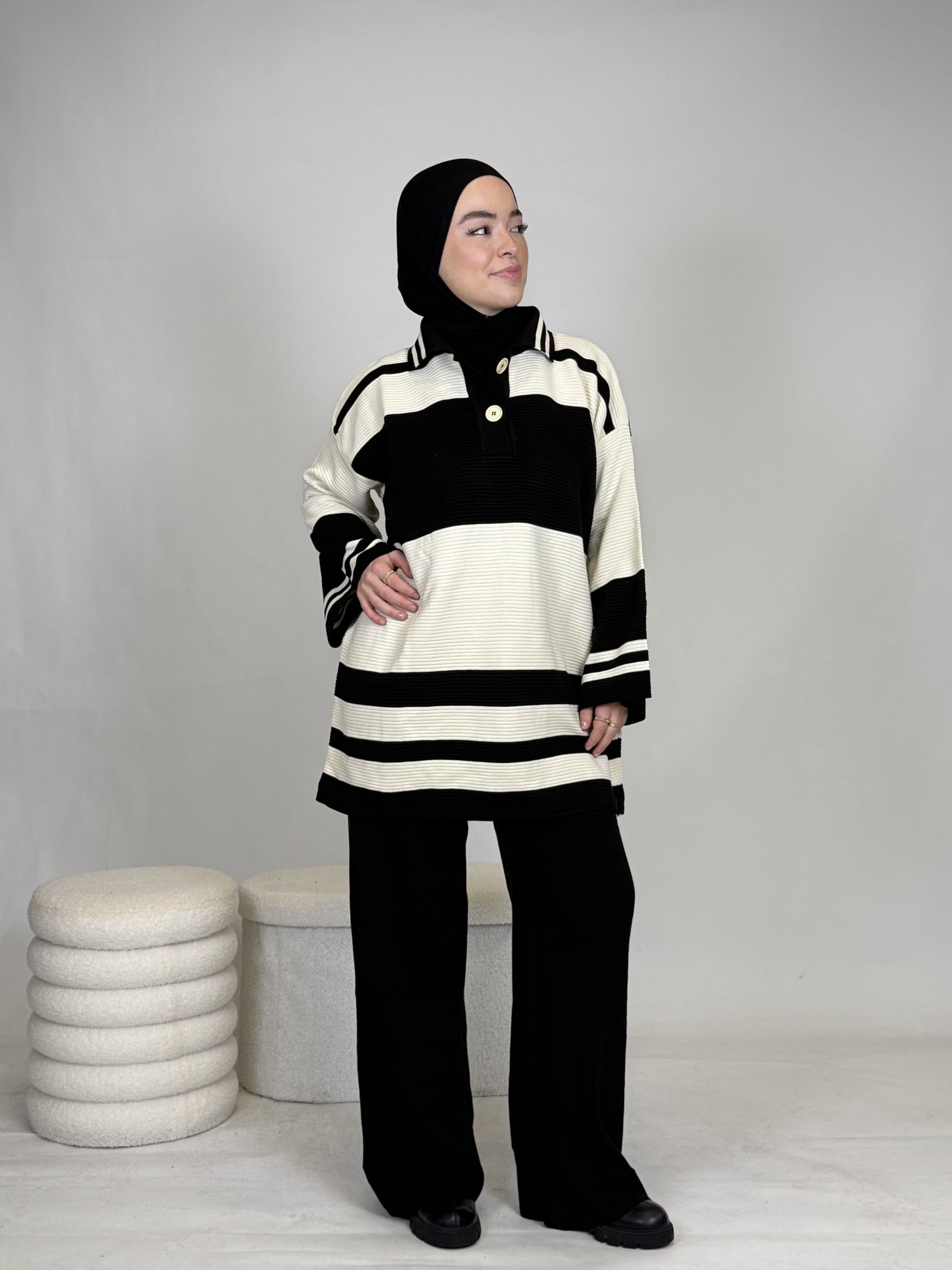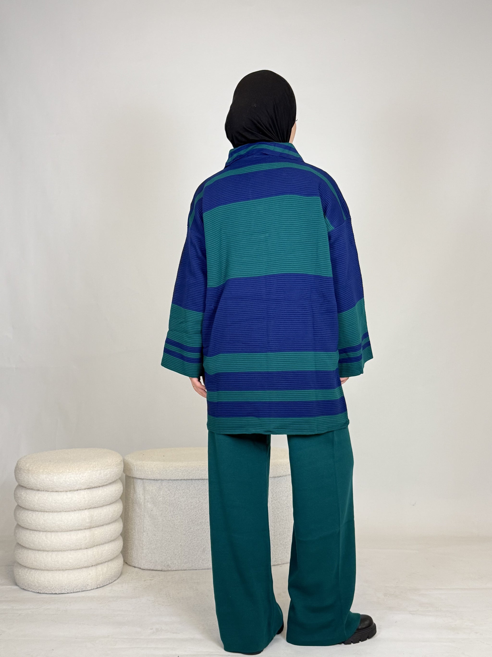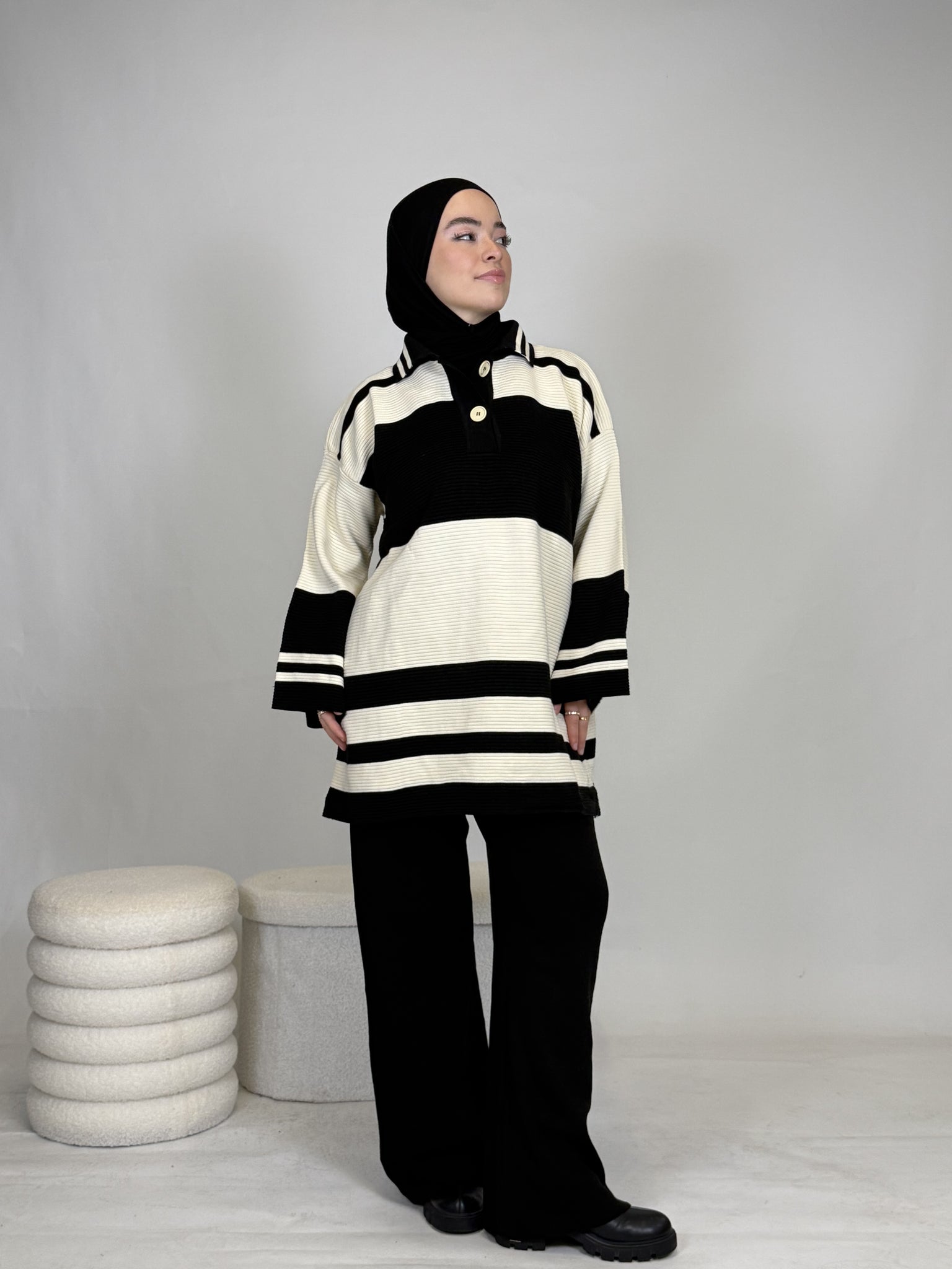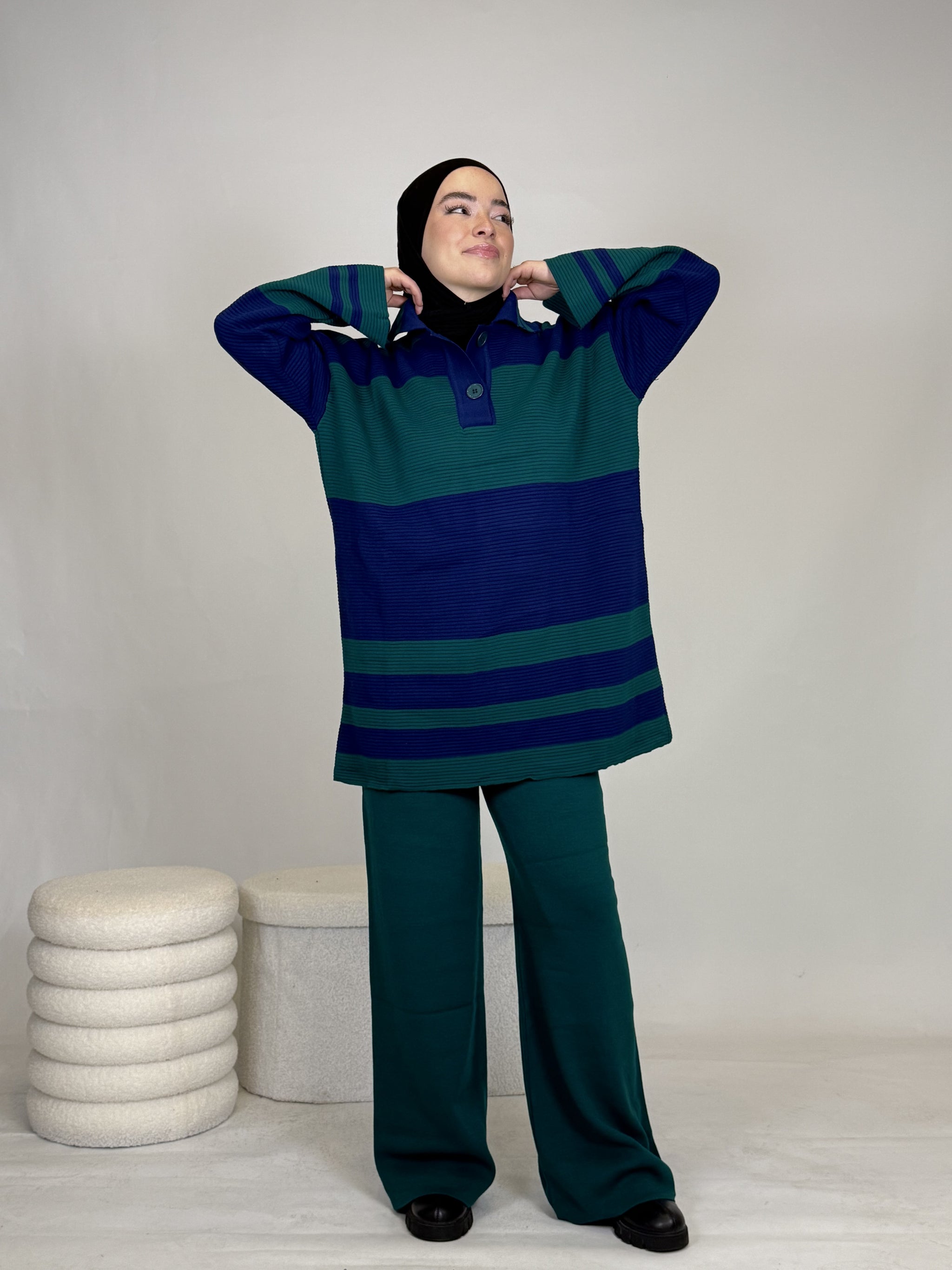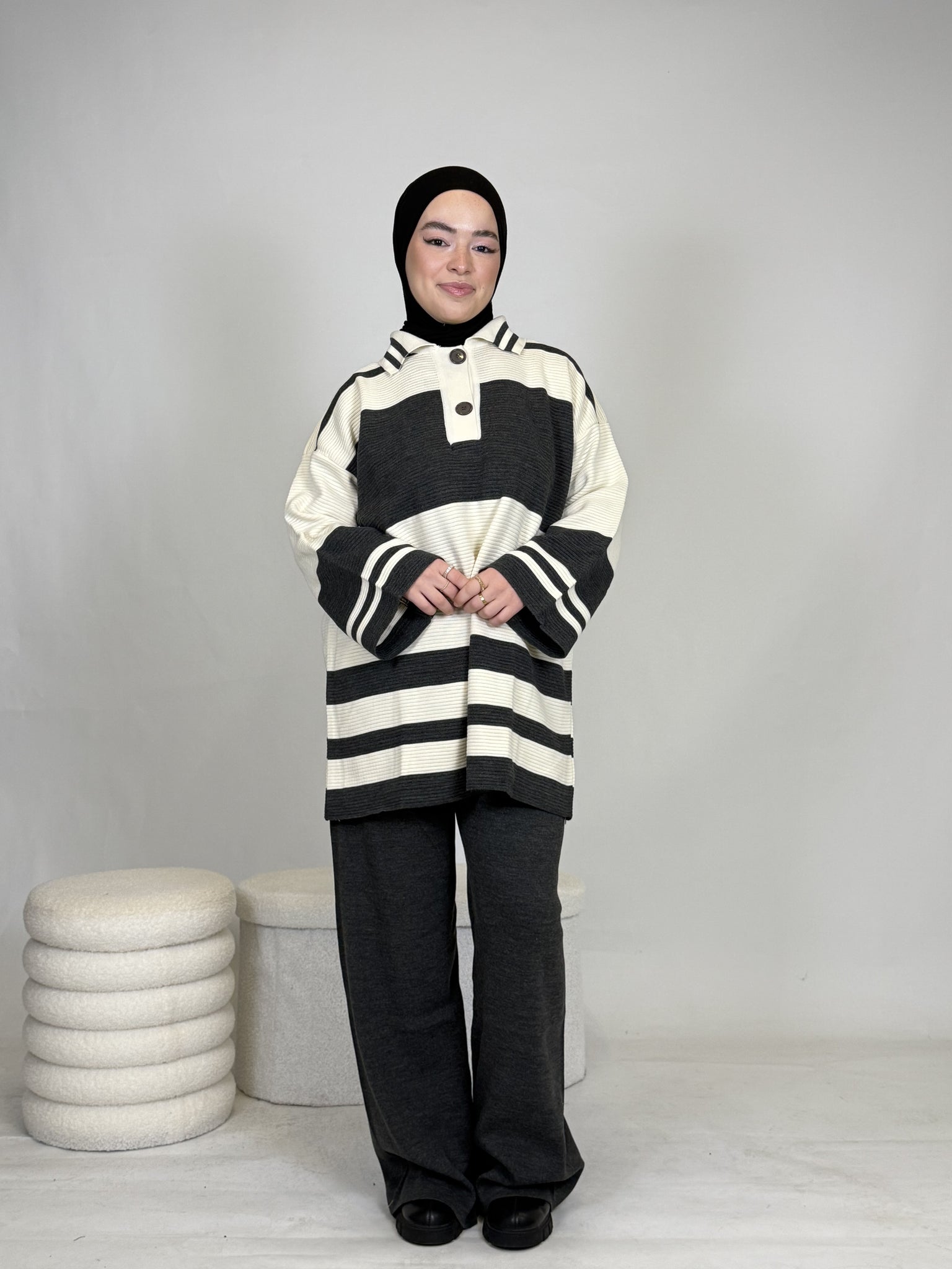 Das Set ist ideal, um sich stylisch und unkompliziert anzuziehen, hält dabei extrem warm und ist perfekt für Alltag oder besondere Anlässe. Das Oberteil ist breit geschnitten und bietet eine bequeme, moderne Passform.