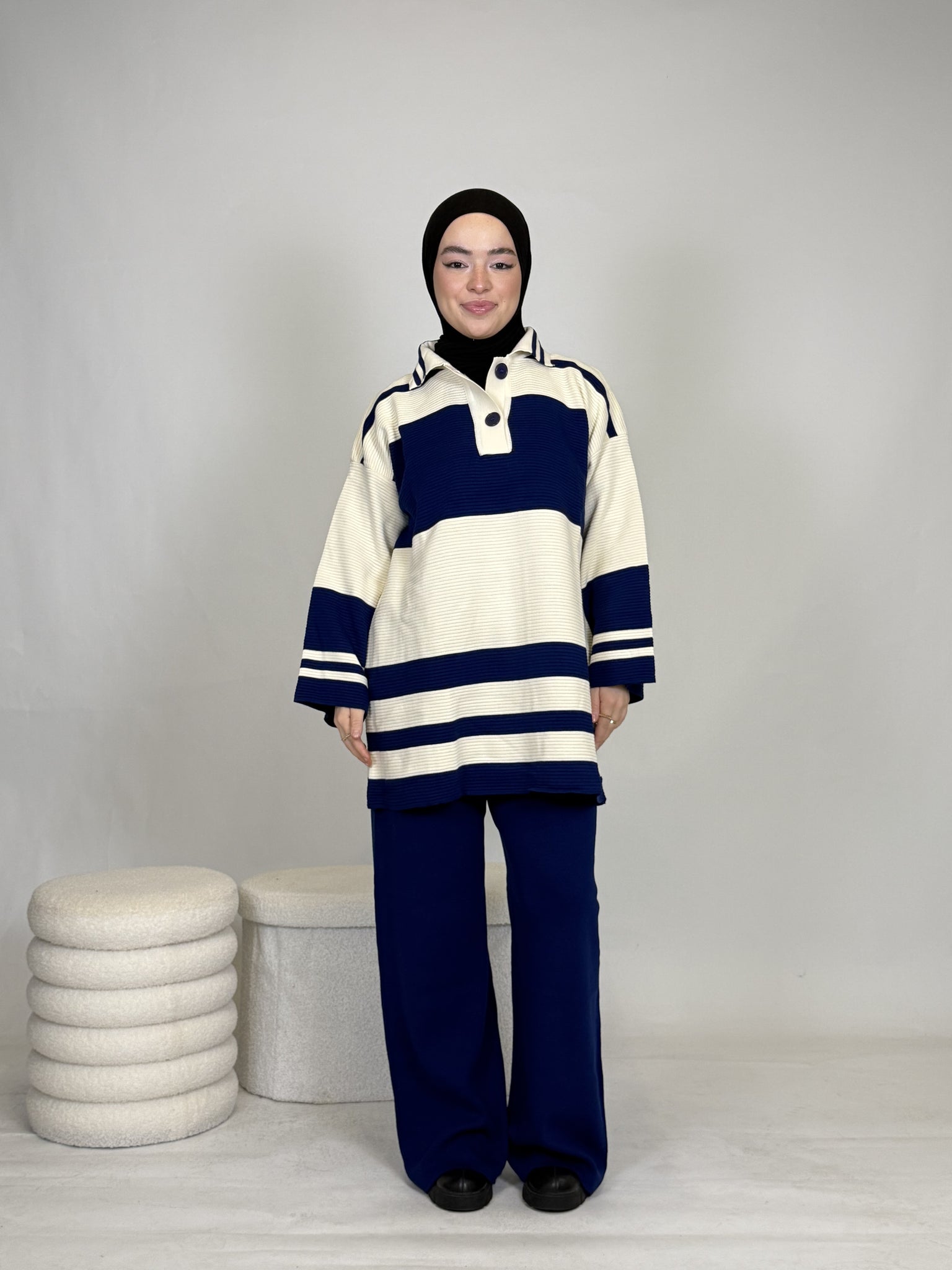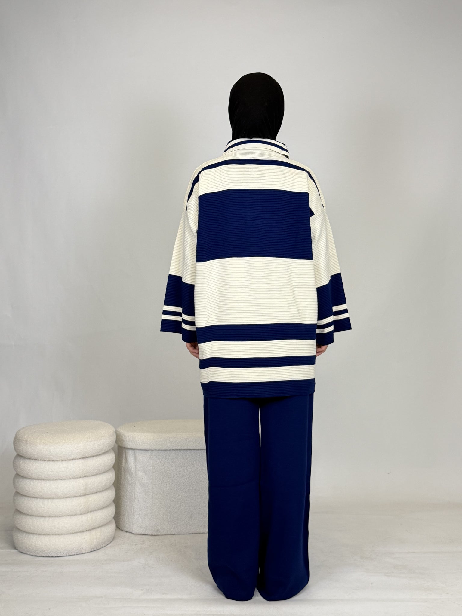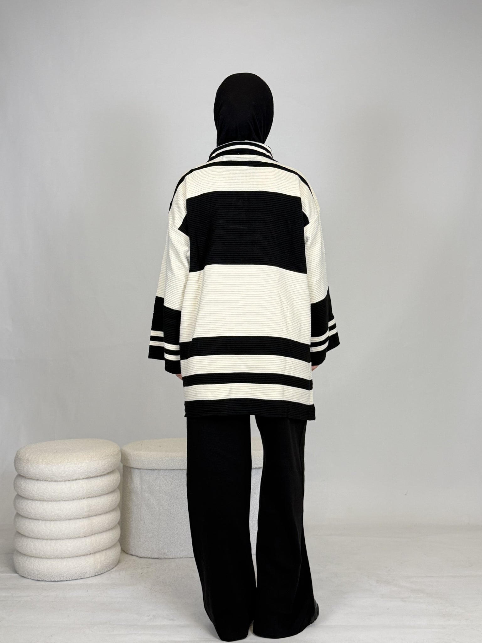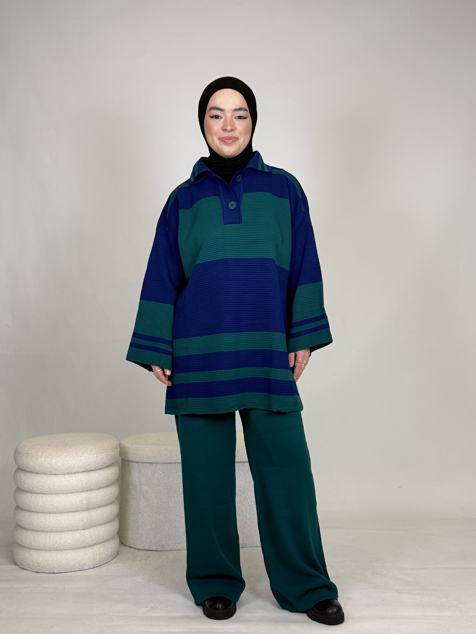 Das Set ist ideal, um sich stylisch und unkompliziert anzuziehen, hält dabei extrem warm und ist perfekt für Alltag oder besondere Anlässe. Das Oberteil ist breit geschnitten und bietet eine bequeme, moderne Passform.
