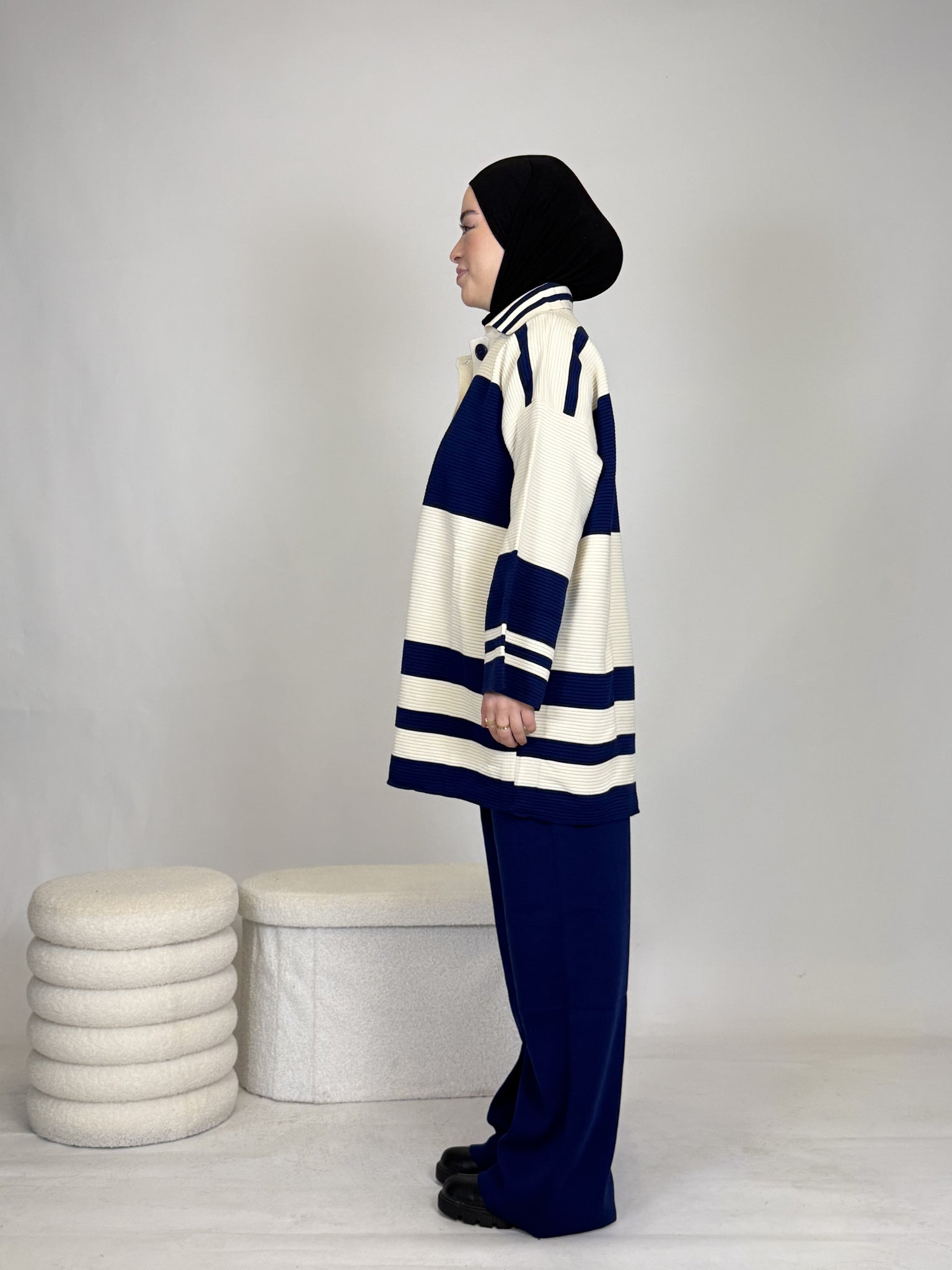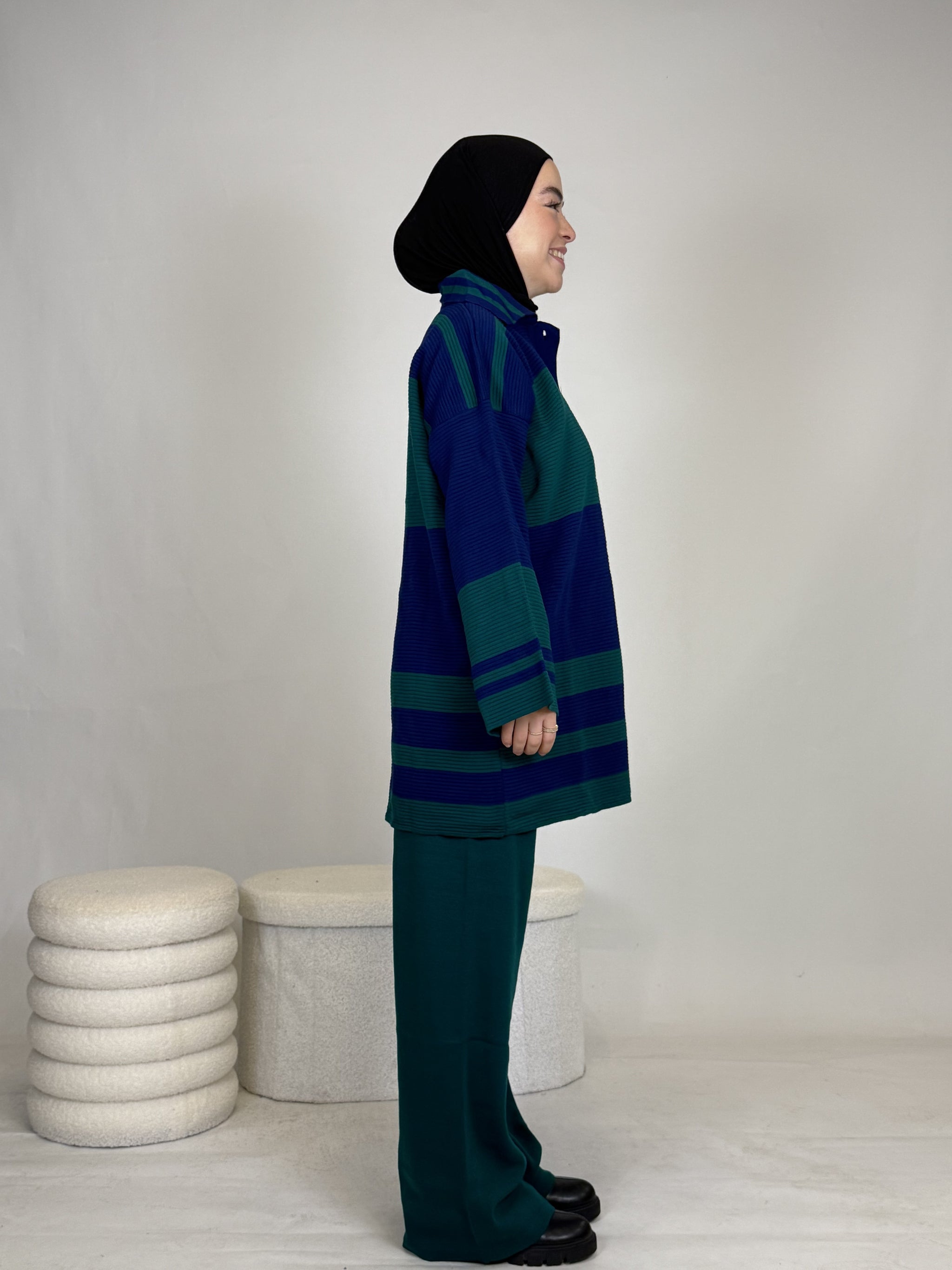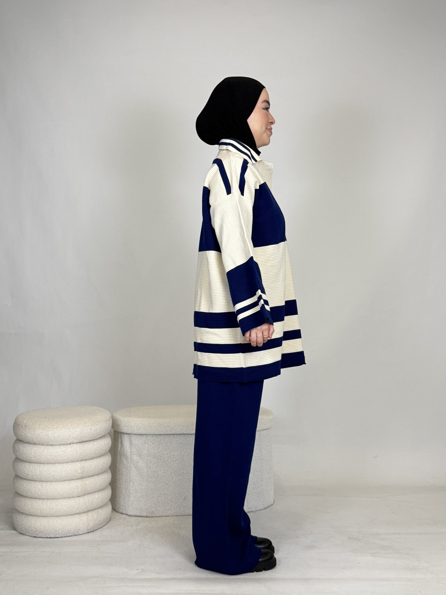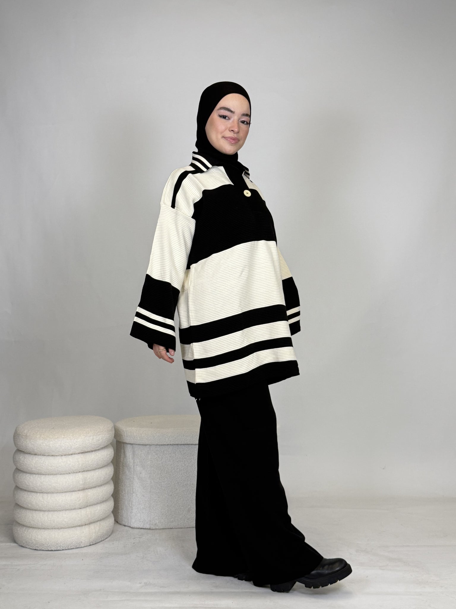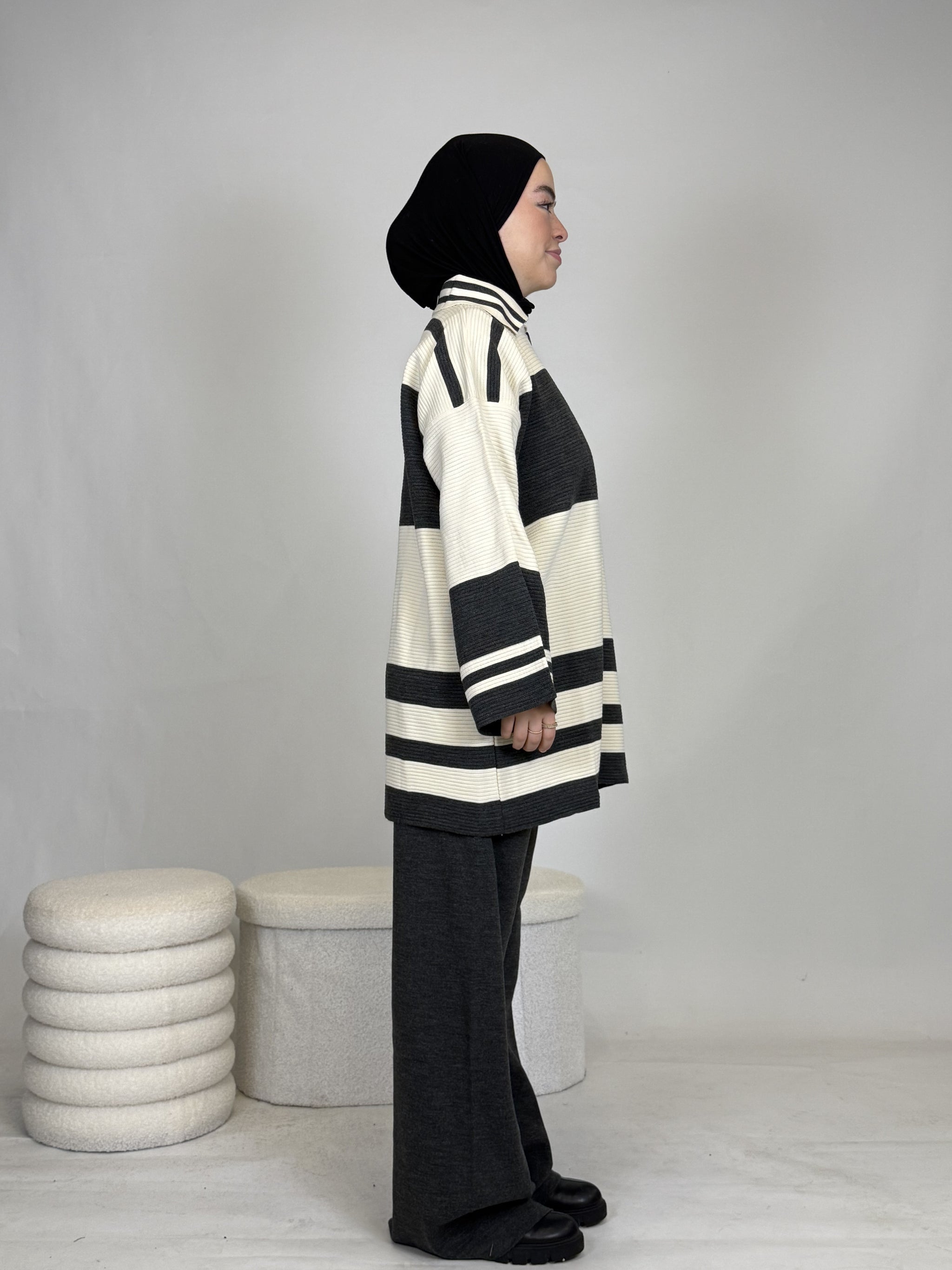 Das Set ist ideal, um sich stylisch und unkompliziert anzuziehen, hält dabei extrem warm und ist perfekt für Alltag oder besondere Anlässe. Das Oberteil ist breit geschnitten und bietet eine bequeme, moderne Passform.